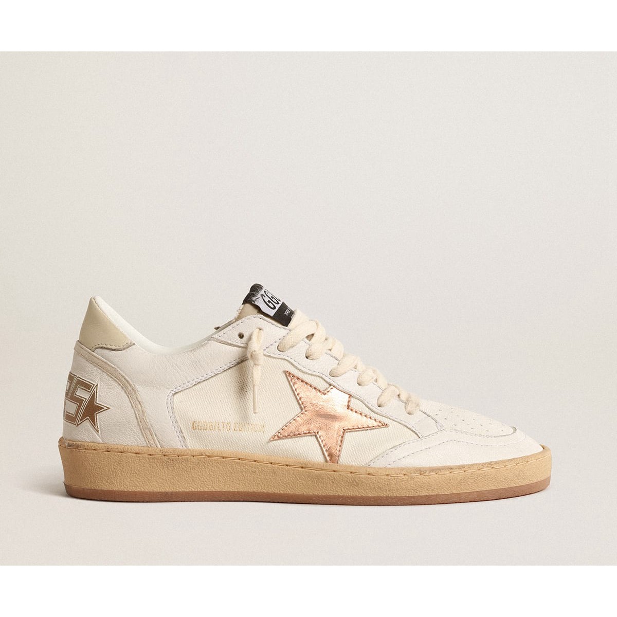 Scarpe Ginnastica a stelle con palla d’oca dorate in tela bianca e pelle con inserti in pelle in avorio e stella in pelle nappa nera GMF00327.F003426.11199