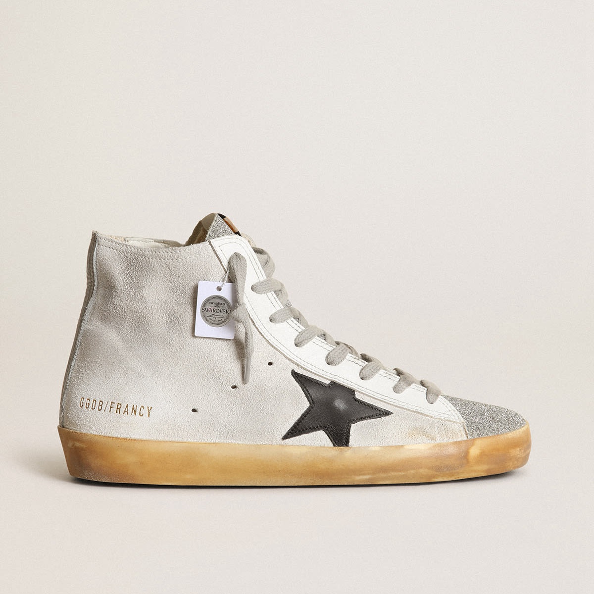 Scarpe Ginnastica francesi d’oca d’oro in pelle scamosciata bianca con lingua in micro-cristalli di Swarovski e stella in pelle nera GWF00113.F003367.10250