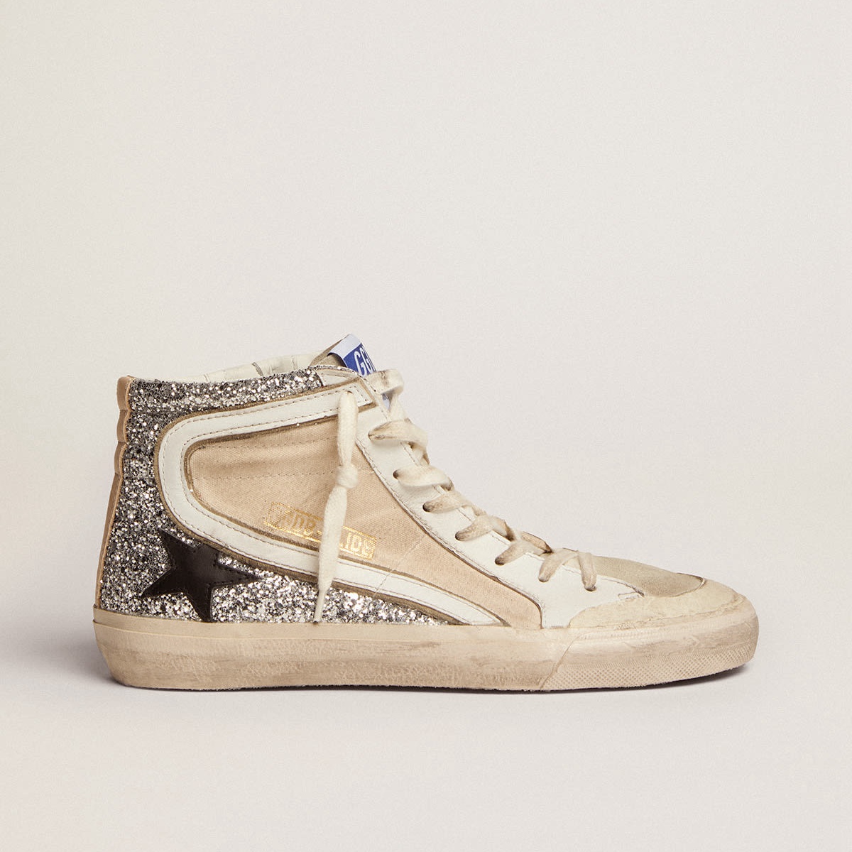 Scarpe Ginnastica per diapositive Golden Goose Penstar in tela color crema e glitter d’argento con stella in pelle nera GWF00286.F002673.81568