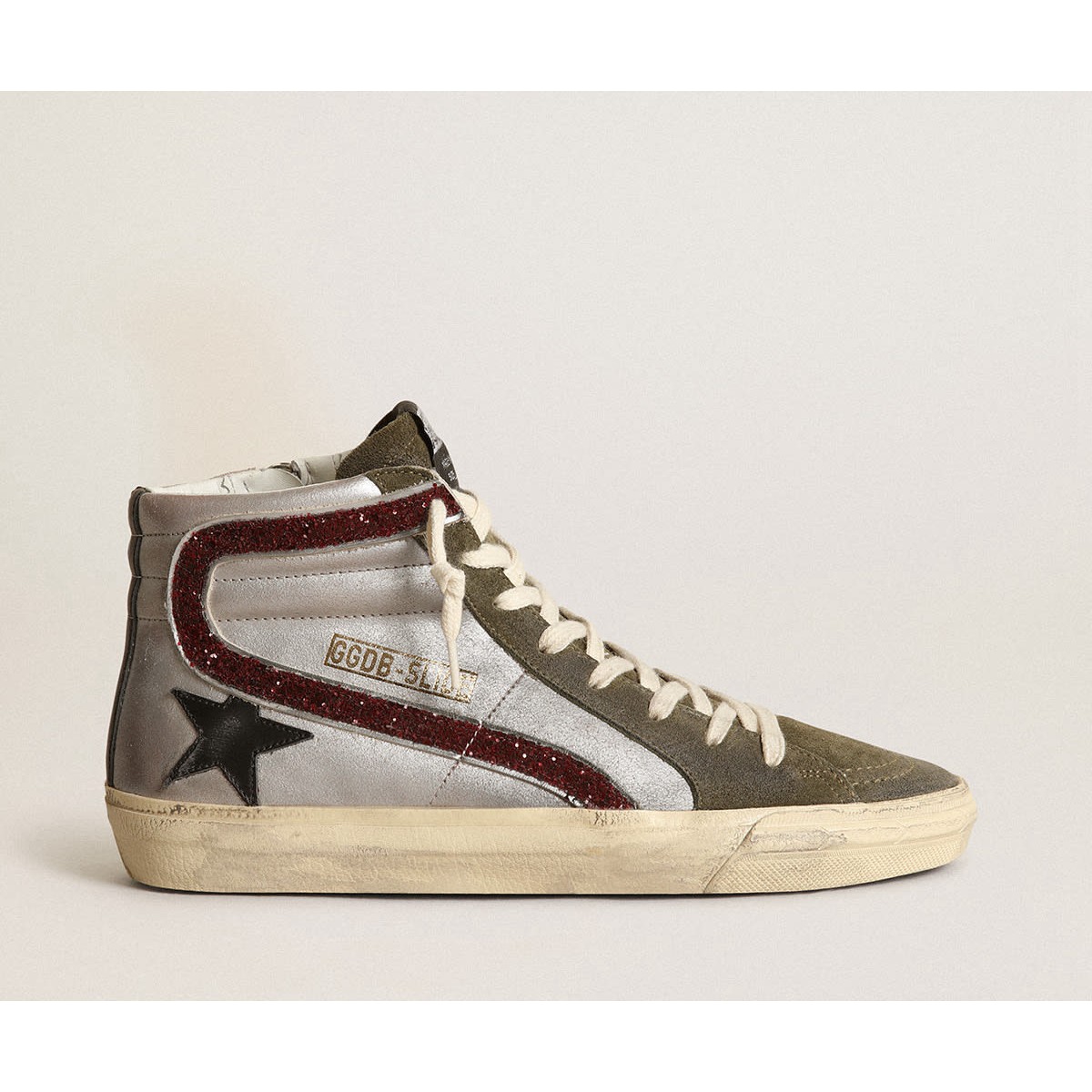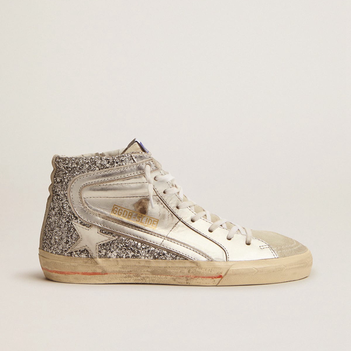 Scarpe Ginnastica per diapositive d’oca dorate con tomaia in pelle laminata e glitter in argento GWF00116.F001046.70160