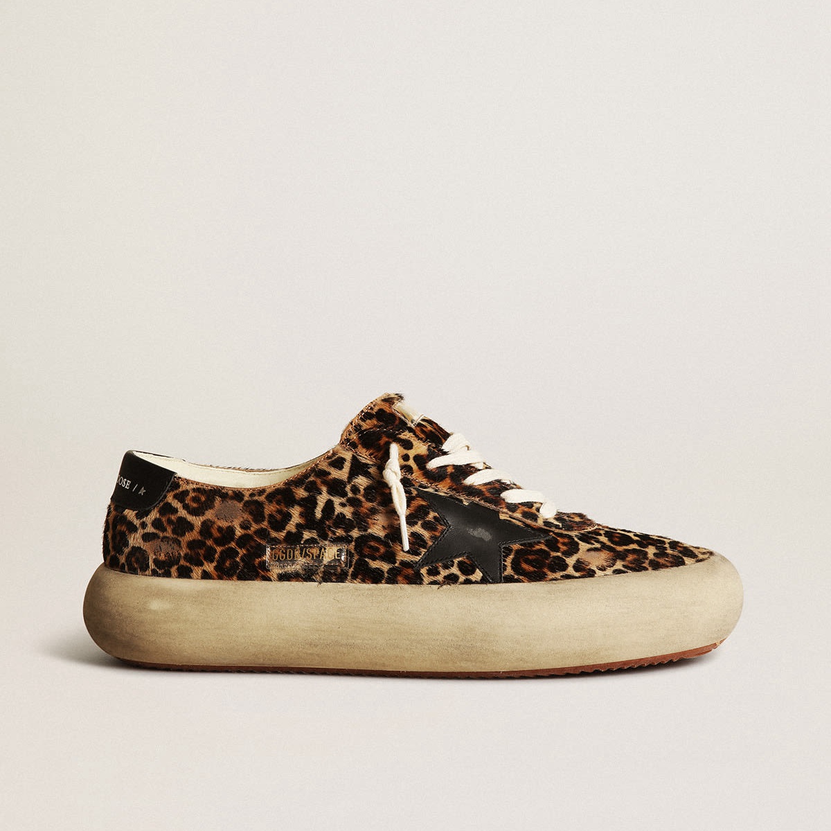Scarpe a stelo spaziale d’oca dorate in pelle di pony con stampa leopardata con stella in pelle nera e tavola tavola GMF00378.F003305.81472