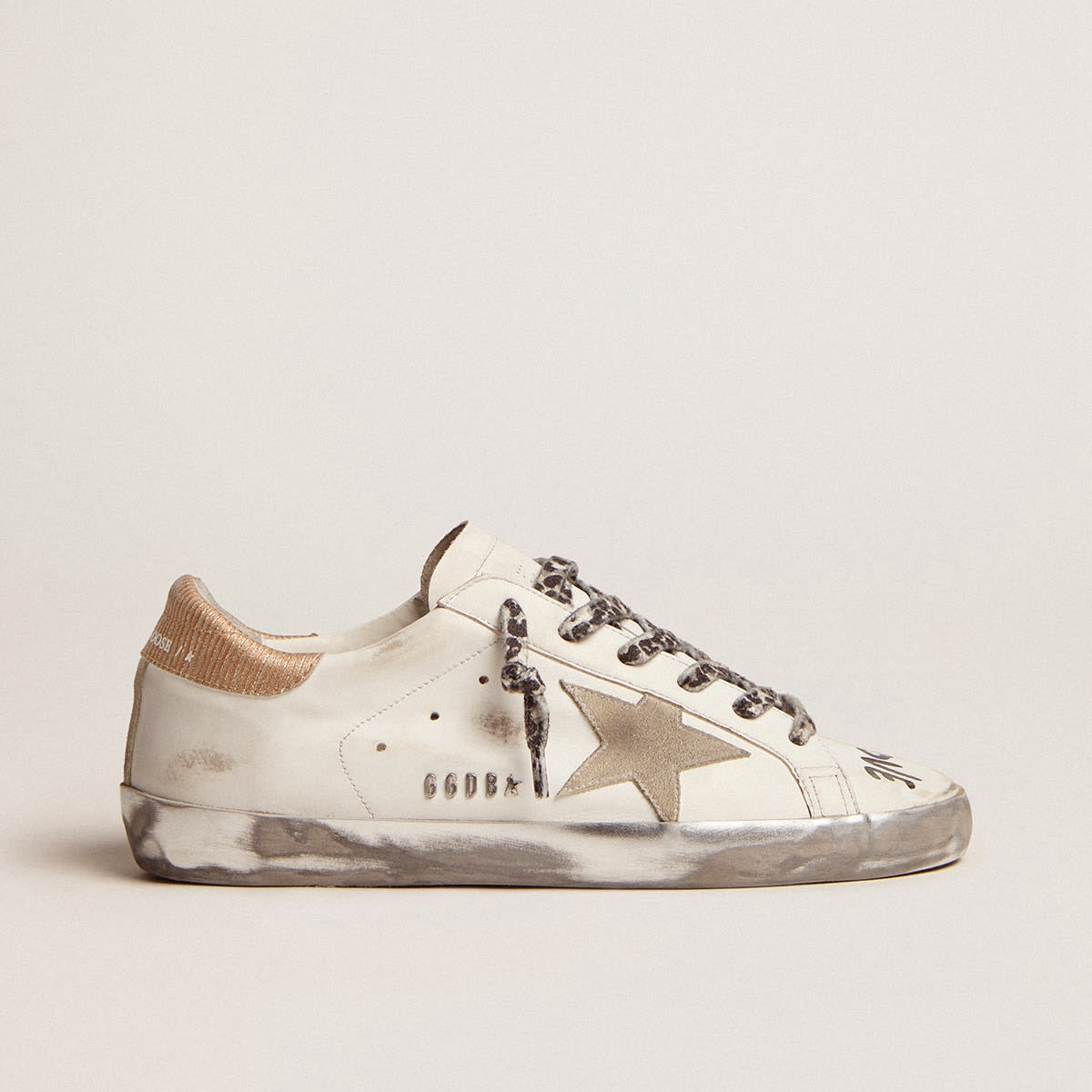 Scarpe Ginnastica super-star d’oca d’oro in pelle bianca con stella in pelle scamosciata grigio ghiaccio e lettere nera contrastanti GWF00101.F002696.10943
