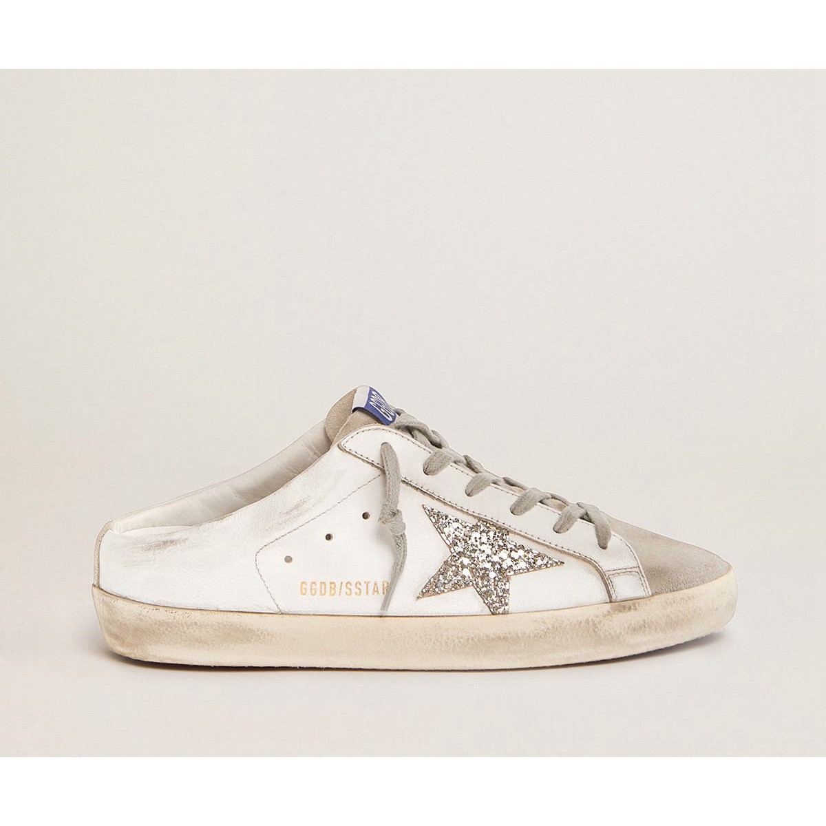 Sabot Golden Goose Super-Star in pelle bianca e pelle scamosciata grigia con stella glitter d’argento GWF00110.F001722.81194