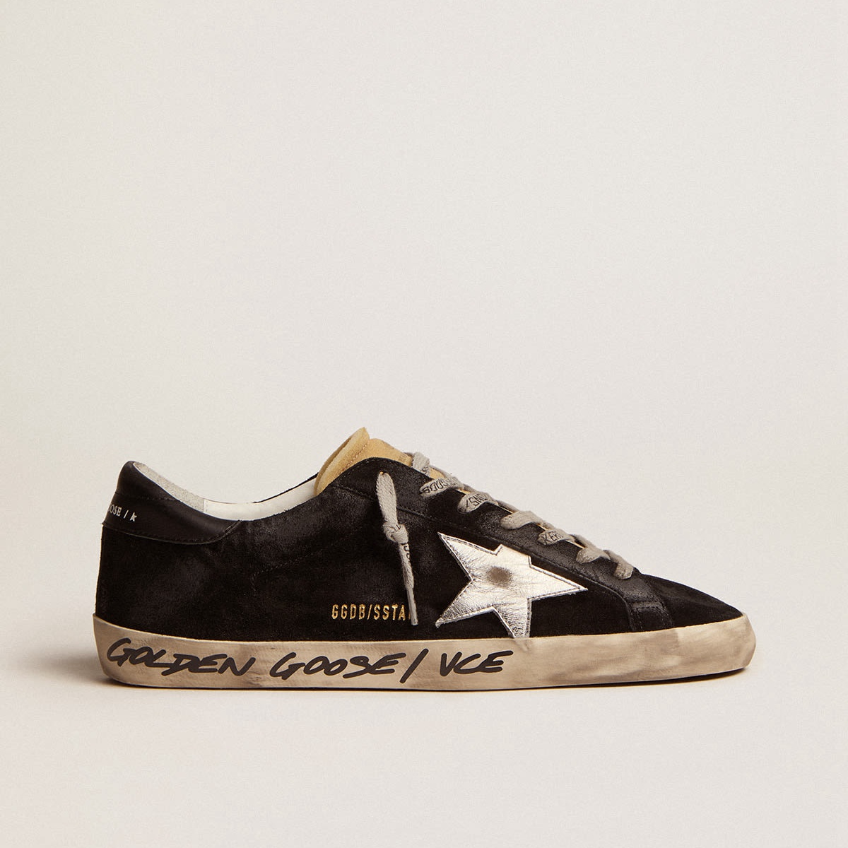 Scarpe Ginnastica super-star d’oca dorate in pelle scamosciata nera con stella in pelle laminata in argento GMF00101.F002679.90179