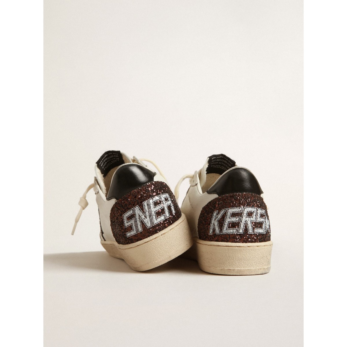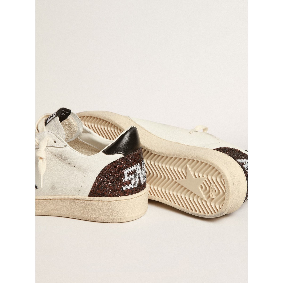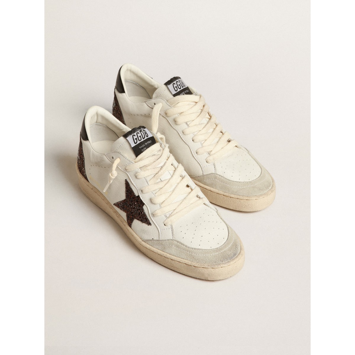 Sognando gli anni Ottanta. Le nostre Scarpe Ginnastica a stella della palla hanno un’atmosfera universitaria americana catturata tra un tiro a cerchio e un giro di skateboard. Questo modello con una tomaia in pelle nappa bianca presenta una stella glitter marrone e una linguetta nera di tacco in pelle nappa. La punta in pelle scamosciata grigio ghiaccio e i lacci color crema aggiungono il tocco finale: cose belle che non passano mai di moda.