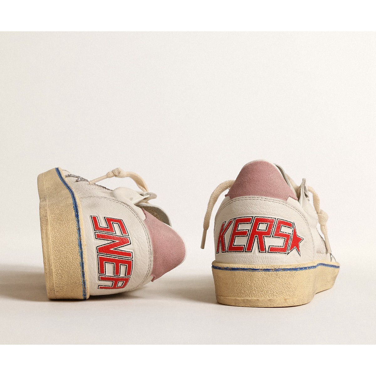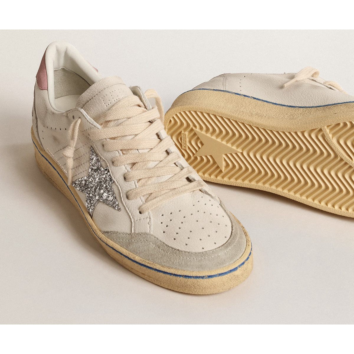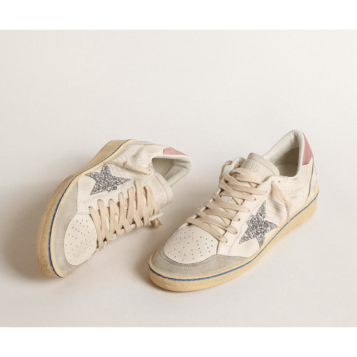 Sogni degli anni ’80. Le nostre Scarpe Ginnastica a stella della palla hanno un’atmosfera universitaria americana catturata tra un tiro a cerchio e un giro di skateboard. Questo modello con una tomaia in pelle nappa bianca presenta una stella glitter d’argento e una linguetta di tacco in pelle scamosciata rosa. La punta in pelle scamosciata grigio ghiaccio, la striscia blu sui lacci volpi e color crema aggiungono il tocco finale: cose belle che non passano mai di moda.
