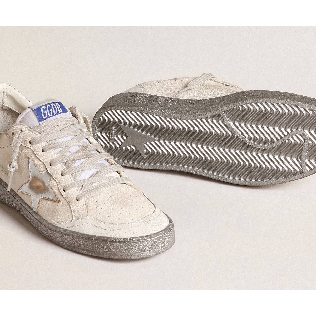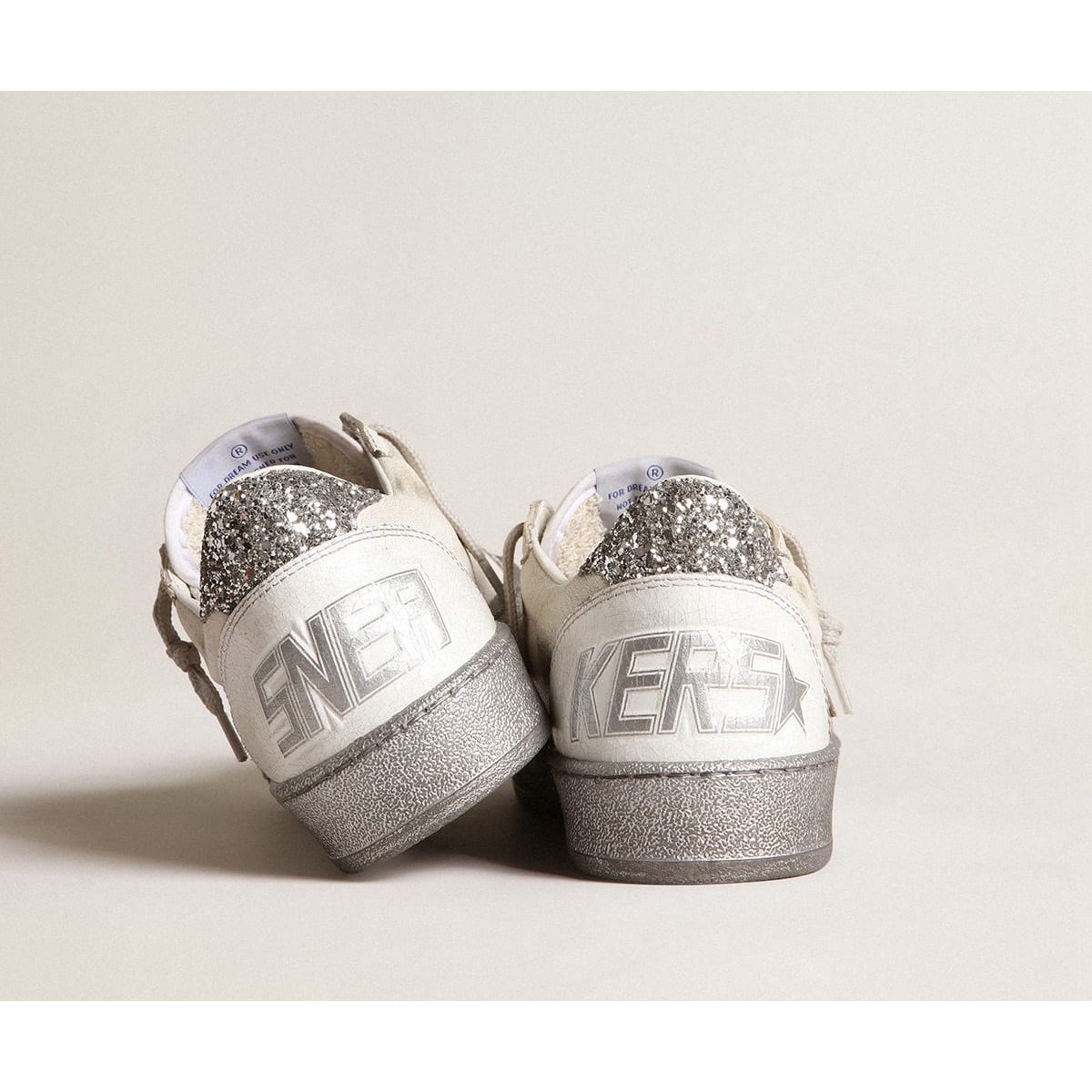 Sogni degli anni Ottanta. Le nostre Scarpe Ginnastica a stella della palla hanno un’atmosfera universitaria americana catturata tra un tiro a cerchio e un giro di skateboard. Questo modello, con una tomaia in pelle nappa bianca, presenta dettagli in argento che illuminano il design: la stella in pelle laminata, la linguetta del tallone glitter e la suola a effetto spray. Gli inserti in pelle di crackle bianca completano il look: belle cose che non passano mai di moda.