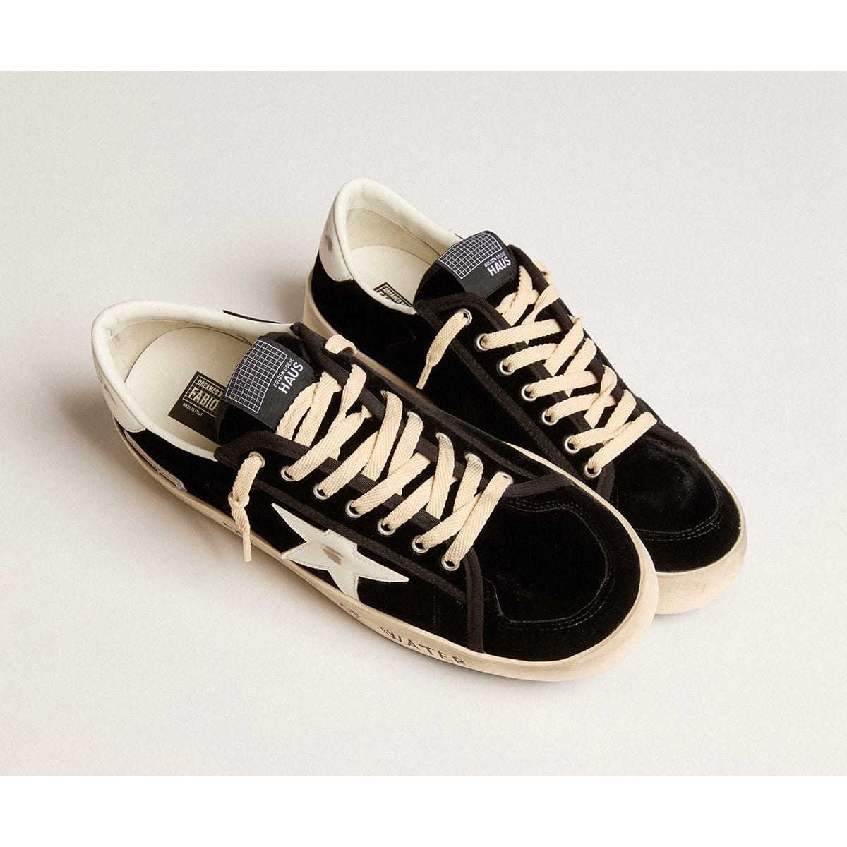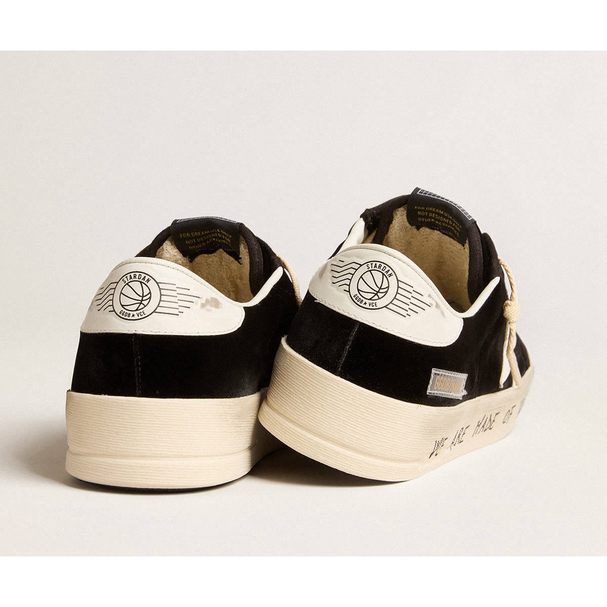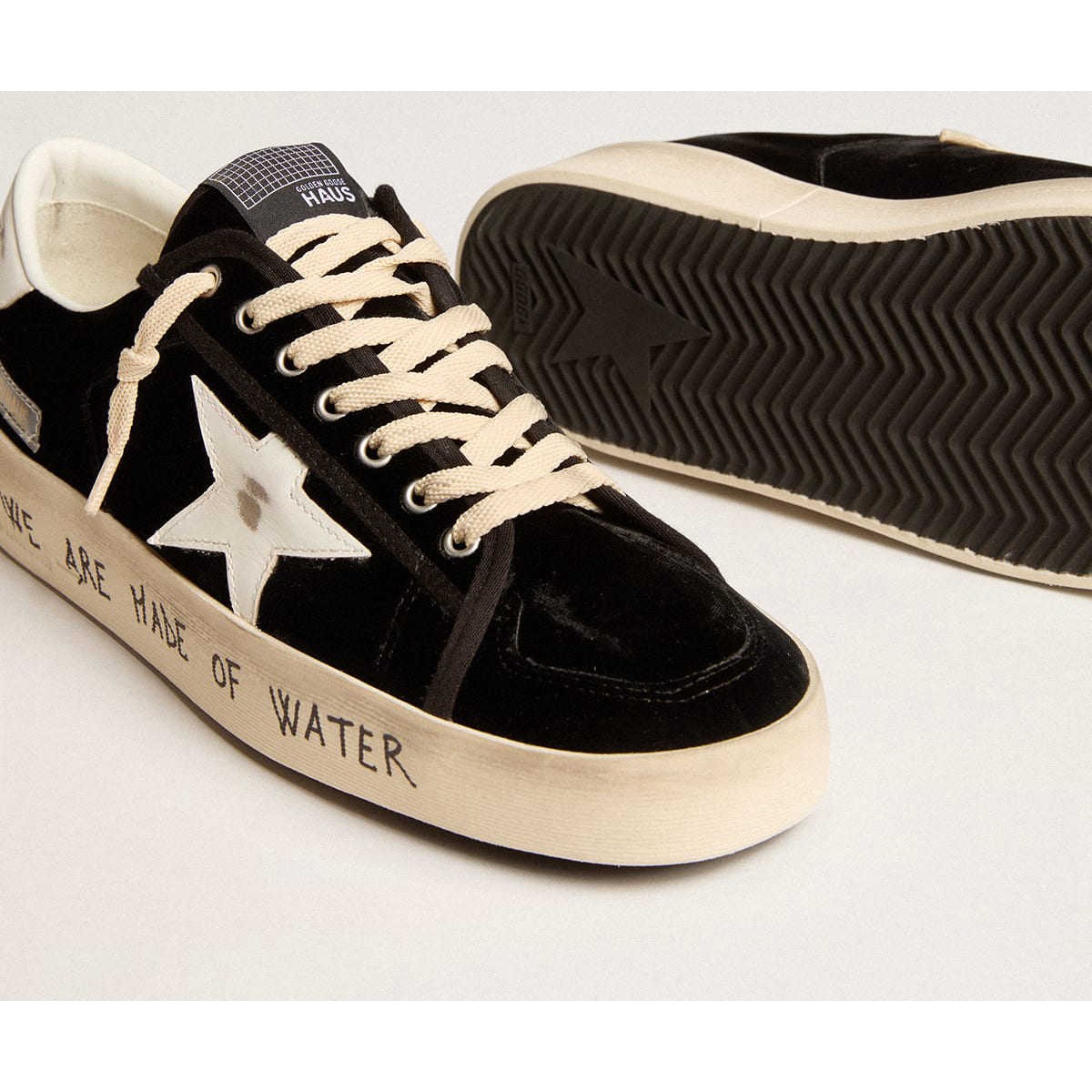 Dreamer Golden Goose da Fabio Novembre. La stardan di questi uomini è ispirata alla tradizionale scarpa veneziana, la pantofola Furlane. Progettati dall’artista e fatti a mano in Italia, presentano una tomaia in velluto nero, una stella in pelle bianca e una fodera in avorio. Il messaggio indelebile dell’artista “Siamo fatti di acqua. E così è il mondo” è stampato sullo schermo sulla volpe come il tocco finale.