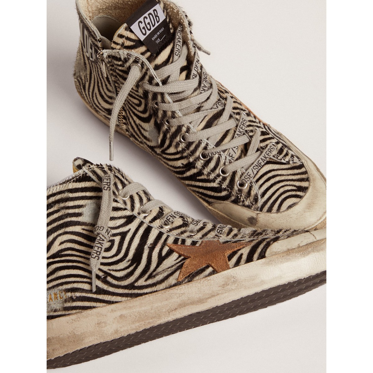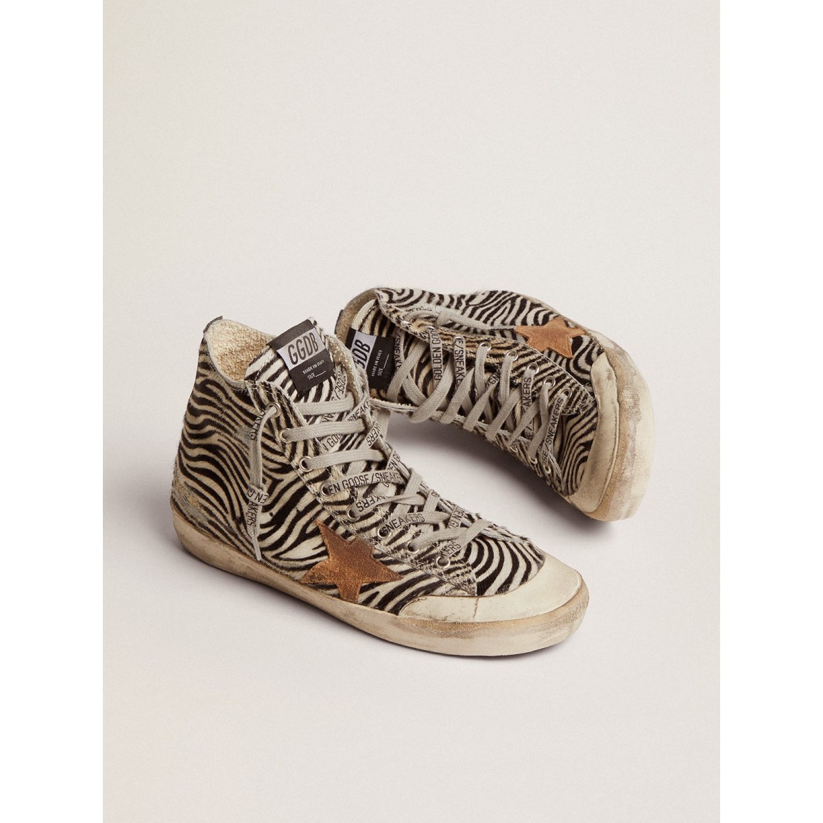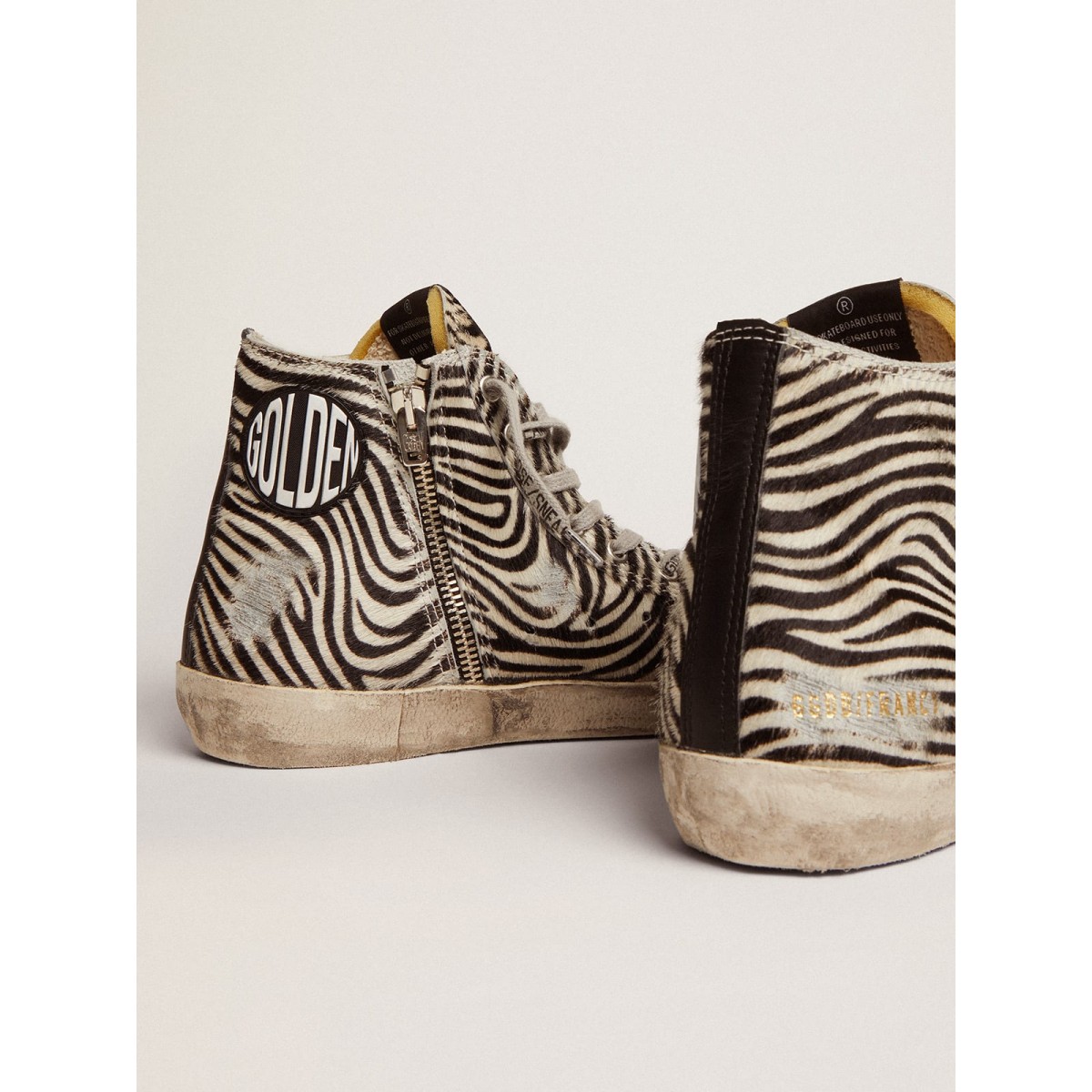 Gli anni Settanta, oggi: ispirati al mondo del basket, lo stile delle Scarpe Ginnastica francesi viene aggiornato con dettagli inaspettati e finiture speciali. Questo modello, con una tomaia di pony a stampa zebra in bianco e nero, presenta una stella in pelle scamosciata color tabacco e una linguetta di tacco in pelle nera. I lacci grigio ghiaccio con logo nero contrastante aggiungono il tocco finale.