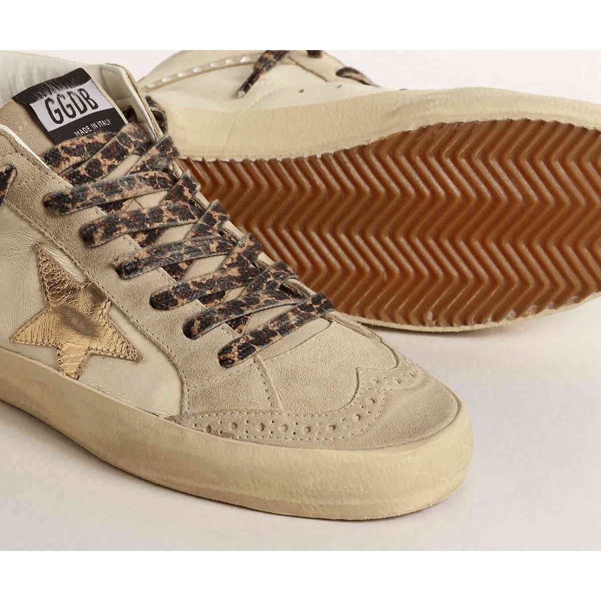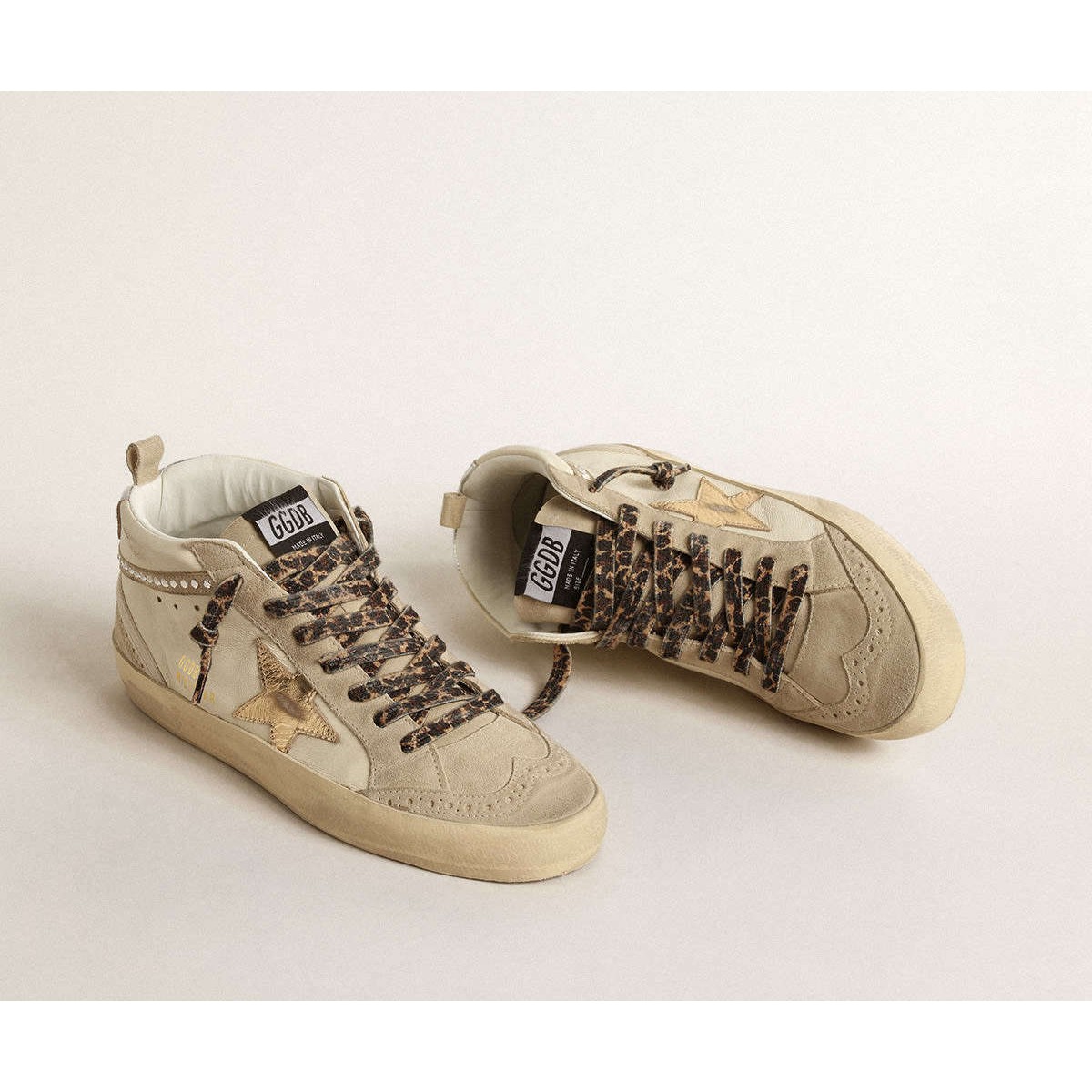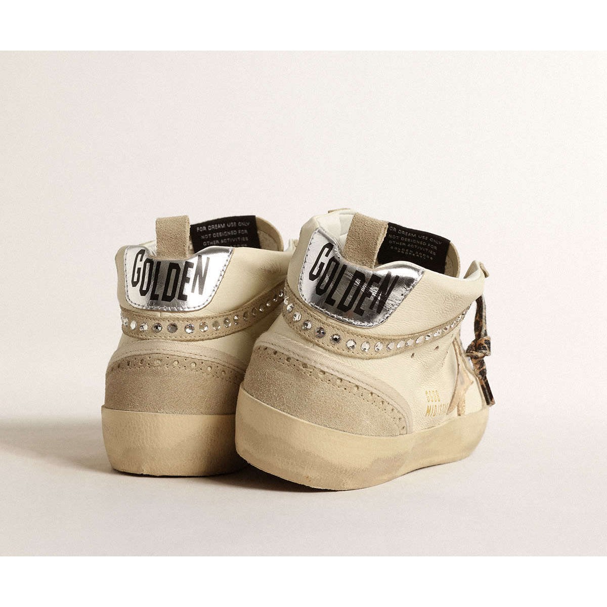 versatilità unicamente elegante: le Scarpe Ginnastica a metà stella adottano un approccio raffinato alla loro ispirazione per la scena di pattinaggio degli anni ’80. Questo modello con tomaia in pelle beige con inserti in pelle scamosciata ECRU presenta una stella in pelle metallica dorata e un flash in pelle scamosciata ECRU con cristalli Swarovski d’argento. La scheda del tallone in pelle metallica d’argento e i lacci della stampa leopardata in sfumature di beige e marrone completano il look.