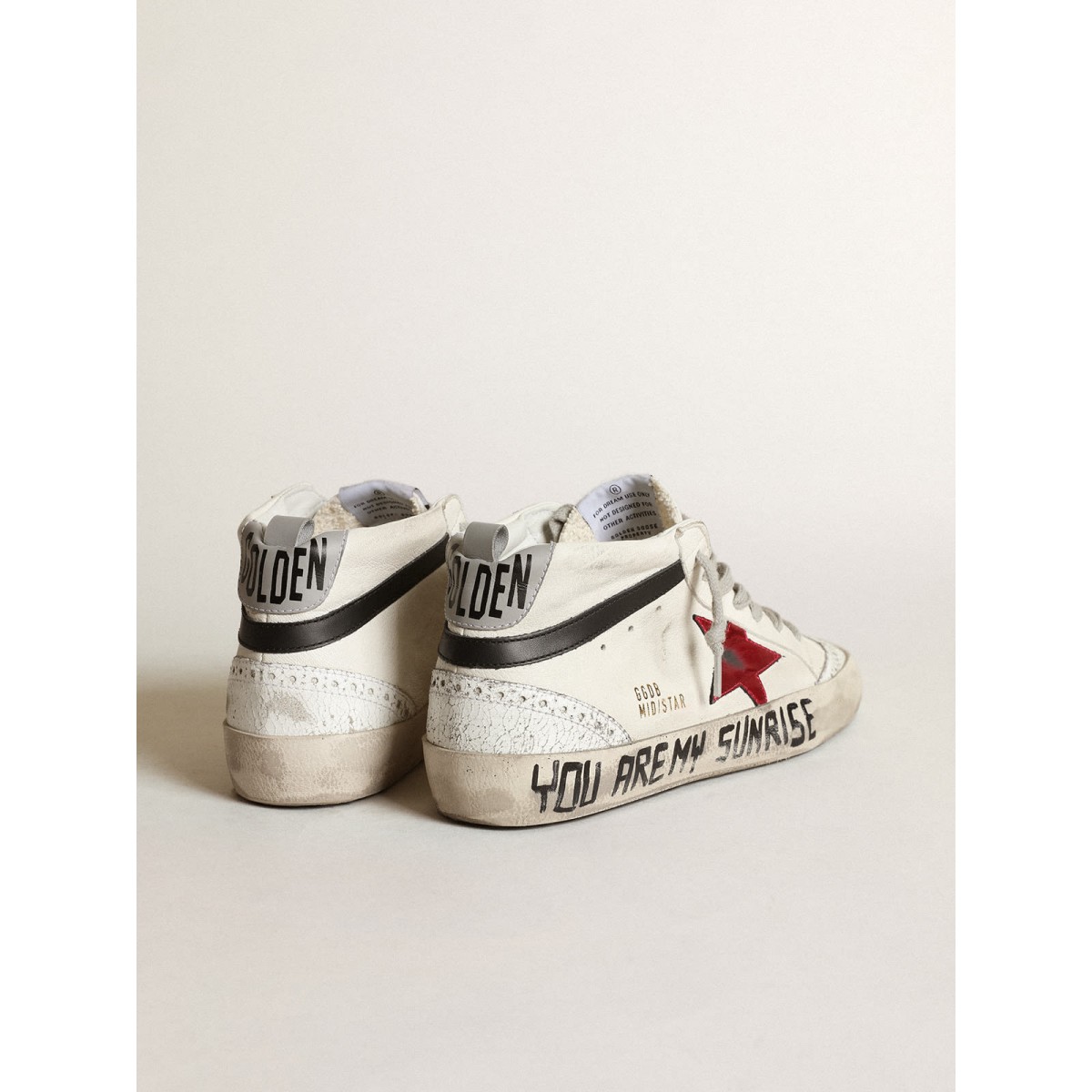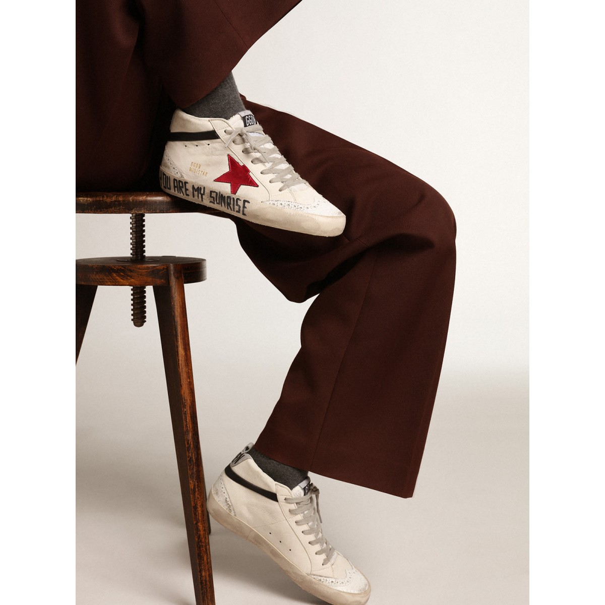 Versatilità univoco elegante: le Scarpe Ginnastica a metà stella adottano un approccio raffinato alla loro ispirazione per la scena di pattinaggio degli anni ’80. Con la loro tomaia bianca in pelle nappa evidenziata da inserti in pelle screpcata bianca, queste scarpe da ginnastica presentano una stella in pelle laminata rosa, una linguetta di tacco in pelle grigio chiaro e un flash in pelle nera. Le lettere “You Are My Sunrise” in nera contrastante sulla volpe, i dettagli del brogue e i lacci dei grigi ghiacciati completano lo stile.