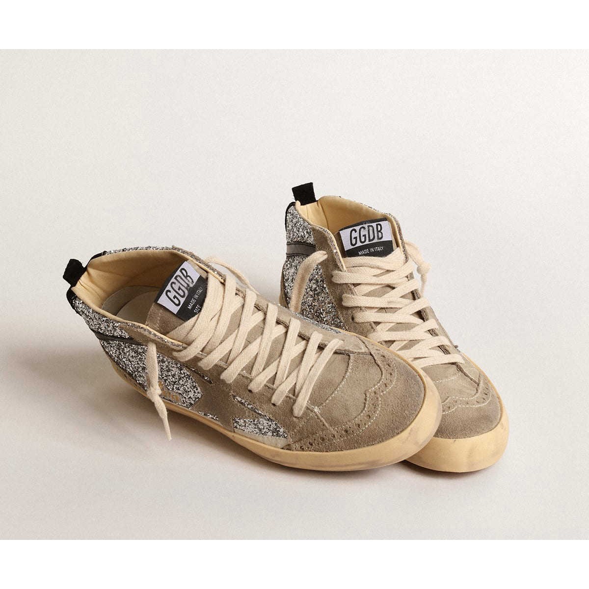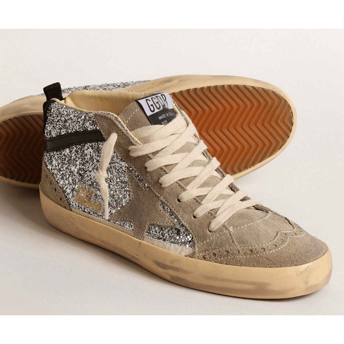 versatilità unicamente elegante: le Scarpe Ginnastica a metà stella adottano un approccio raffinato alla loro ispirazione per la scena di pattinaggio degli anni Novanta. Questo modello con una tomaia glitter argento presenta inserti in pelle scamosciata grigio-grigio, come la stella e la lingua, e un flash in pelle nera. Dettagli di broghire, una scheda del tallone in pelle scamosciata nera e lacci color crema completano il look.