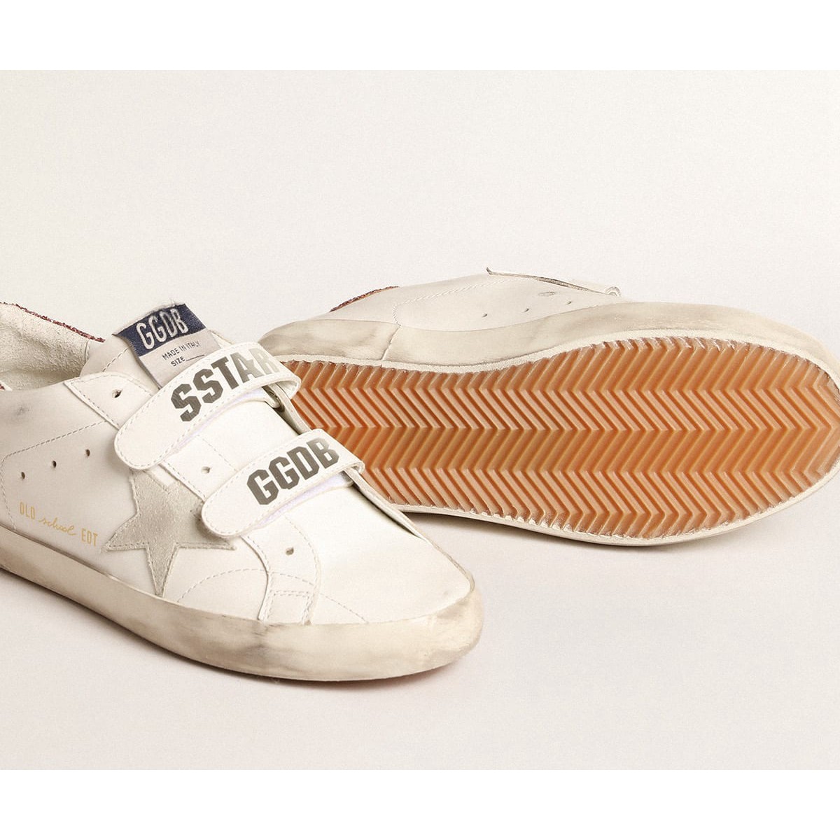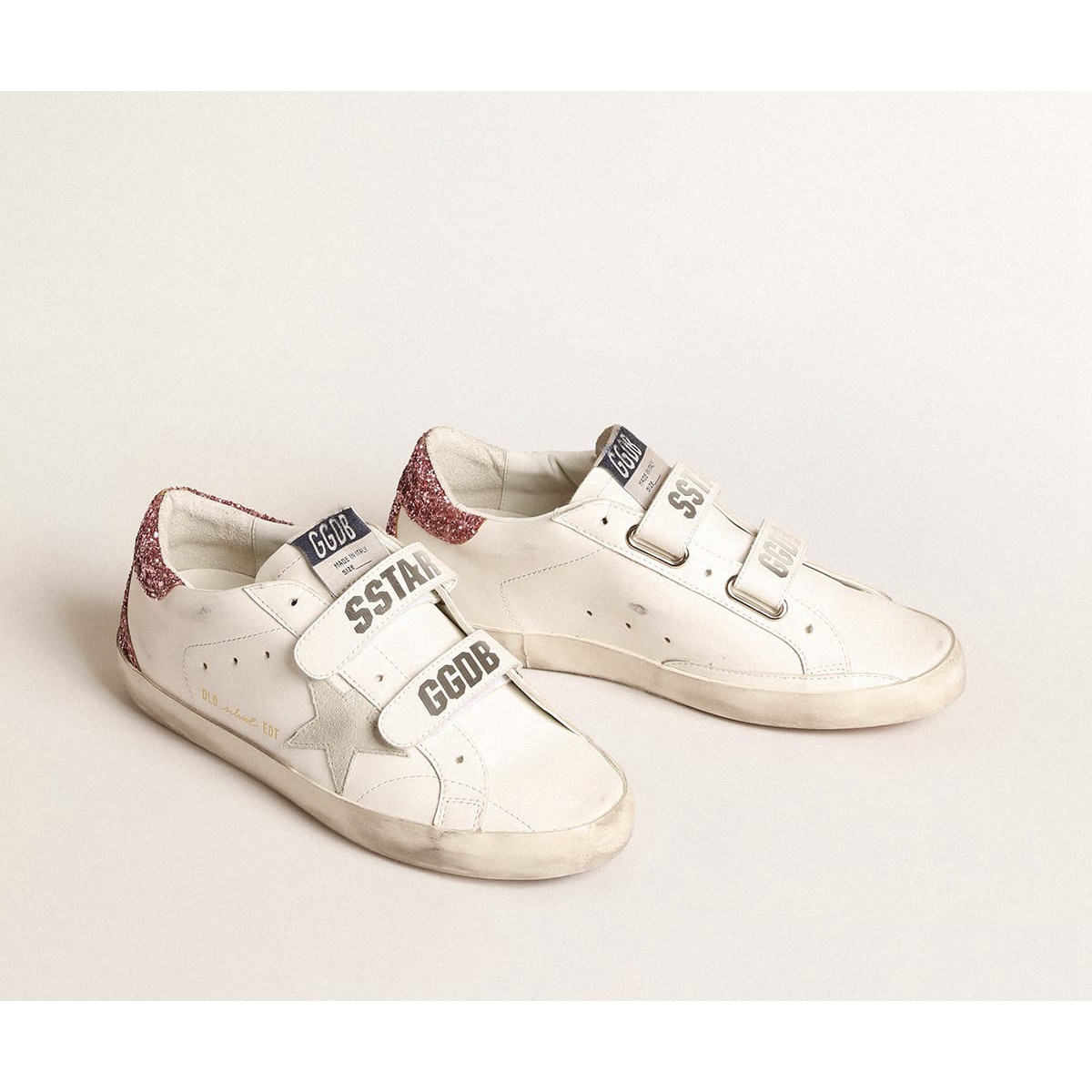 Le nostre Scarpe Ginnastica della vecchia scuola presentano due cinghie in velcro sul davanti Logo contrastante. Questo modello in pelle bianca presenta una stella in pelle scamosciata grigio ghiaccio e una linguetta per glitter rosa. L’inserto glitter rosa sul retro completa l’aspetto.