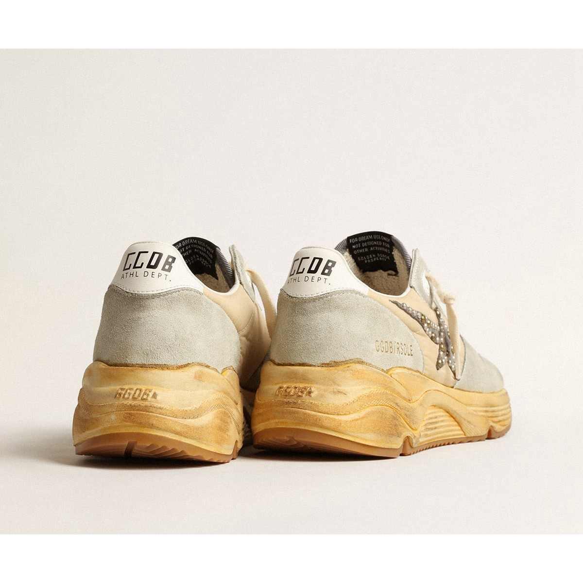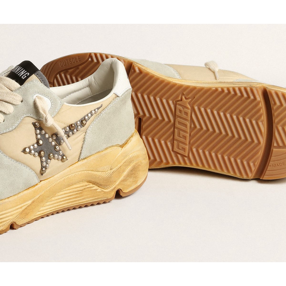 Stile urbano e uno spirito di artigianato sono combinati nelle nostre sola Scarpe Ginnastica da corsa : Il compagno ideale per le tue avventure metropolitane. Con una tomaia in nylon crema accentuata da inserti in pelle scamosciata grigio ghiaccio, questo modello da uomo presenta una stella in pelle scamosciata grigio scuro illuminato da borchie color oro e argento. La linguetta del tallone in pelle bianca e i lacci color crema aggiungono il tocco finale.