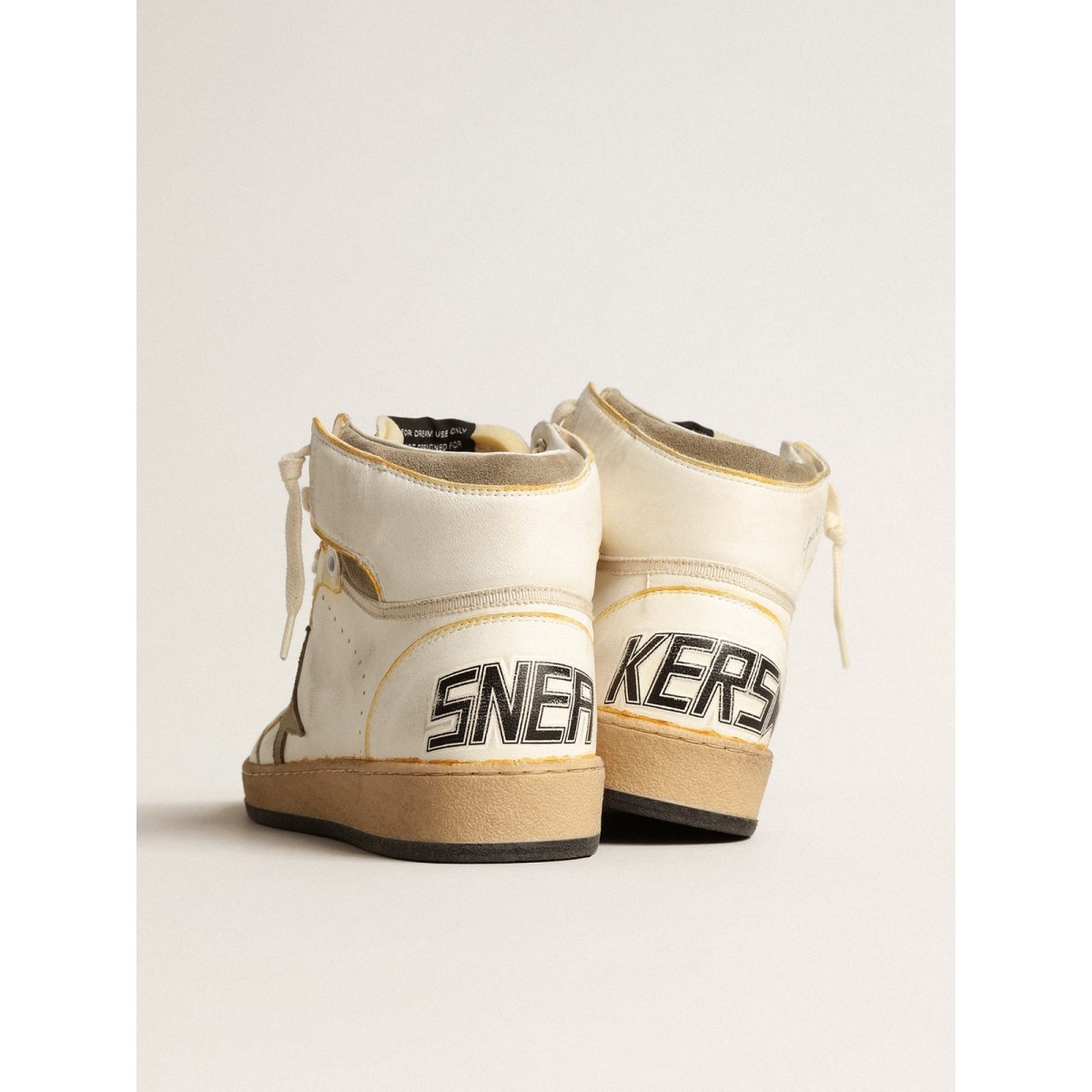 Una reinterpretazione di Scarpe Ginnastica alte con un’anima autentica: ispirata alla nostra modella a stella da ballo, le nostre Scarpe Ginnastica sky-star hanno un’atmosfera universitaria americana e un’atmosfera della scena di basket degli anni ’80. Questo modello femminile, con una tomaia in pelle bianca con effetto ingiallito, presenta una stella in pelle scamosciata grigio-grigio e la firma dell’oca dorata sul collo della caviglia, un riferimento al sogno d’infanzia di far firmare le tue Scarpe Ginnastica preferite dalle leggende del basket. La lingua di nylon beige e i lacci beige completano il look.