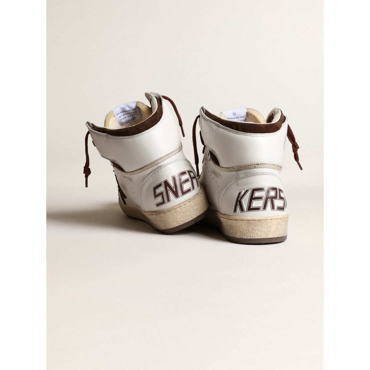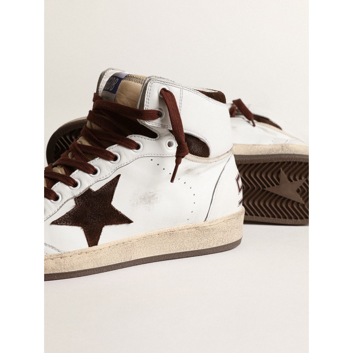 Una reinterpretazione di Scarpe Ginnastica alte con un’anima autentica: ispirata alla nostra modella a stella da ballo, le nostre Scarpe Ginnastica sky-star hanno un’atmosfera universitaria americana e un’atmosfera della scena di basket degli anni ’80. Questo modello da uomo, con una tomaia in pelle nappa bianca, presenta una stella in pelle scamosciata al cioccolato e la firma dell’oca dorata sul collo della caviglia, un riferimento al sogno d’infanzia di far firmare le tue scarpe da ginnastica preferite da Basketball Legends. Gli inserti in pelle scamosciata al cioccolato e i lacci marroni completano il look.