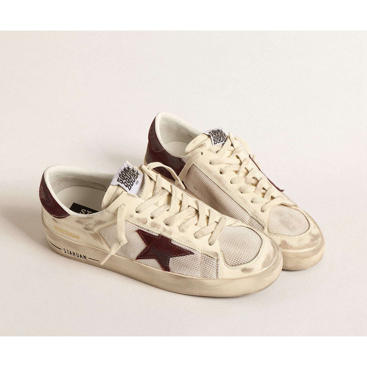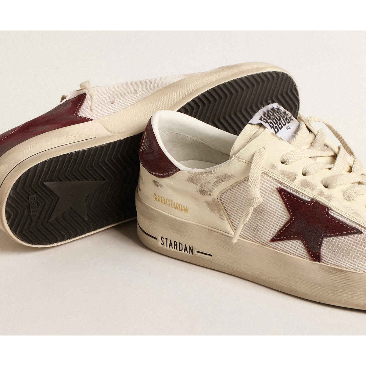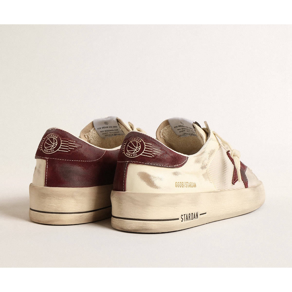i gloriosi novalli avvolti in una Scarpe Ginnastica. Le Scarpe Ginnastica Stardan rendono omaggio alle icone di basket di quel decennio, tenendo d’occhio il presente. Questa versione con una maglia bianca e una tomaia in pelle Ecru Nappa presenta una stella in pelle scamosciata e tallone. Gli inserti asimmetrici in pelle scamosciata rosso-rosso e i lacci Ecru aggiungono il tocco finale.