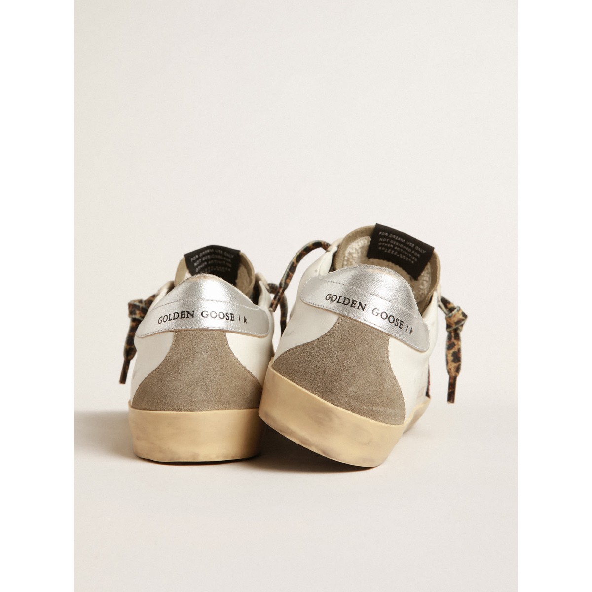 Un’icona senza tempo eppure è in continua evoluzione. A Golden, adoriamo prendere i nostri classici e rielaborarli sempre, sempre da una nuova prospettiva. Queste super stelle con una tomaia in pelle bianca presentano una stella glitter bordeaux, una linguetta in pelle laminata in argento e inserti in pelle scamosciata grigio-grigio, come la lingua e l’inserto sul retro. E i lacci beige e marroni per impronte leopardati aggiungono il tocco finale.