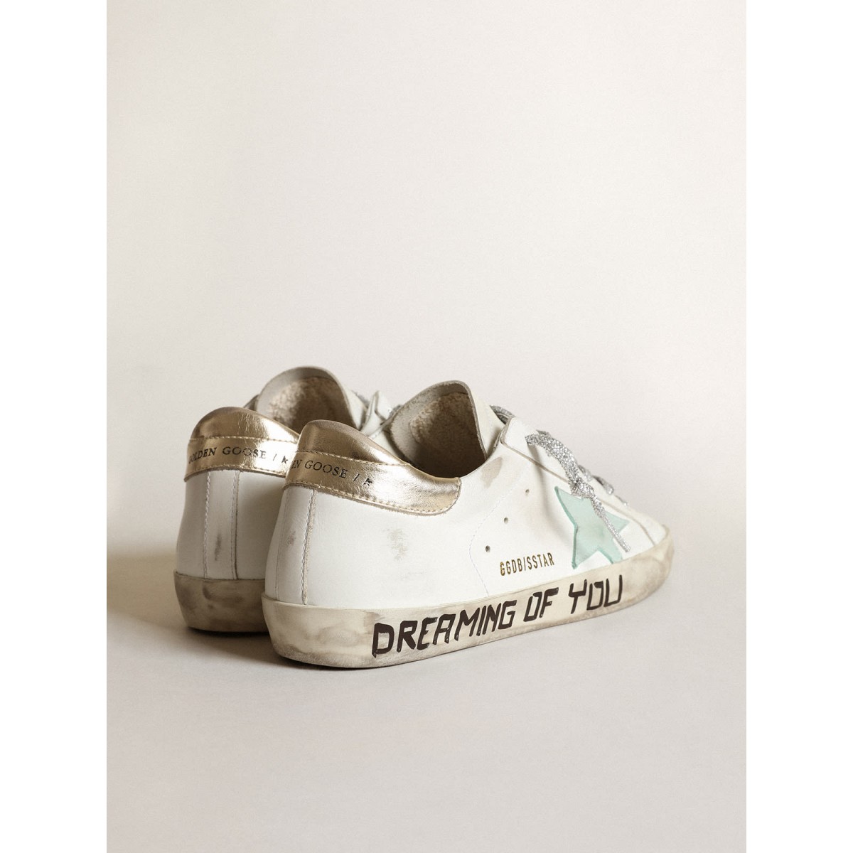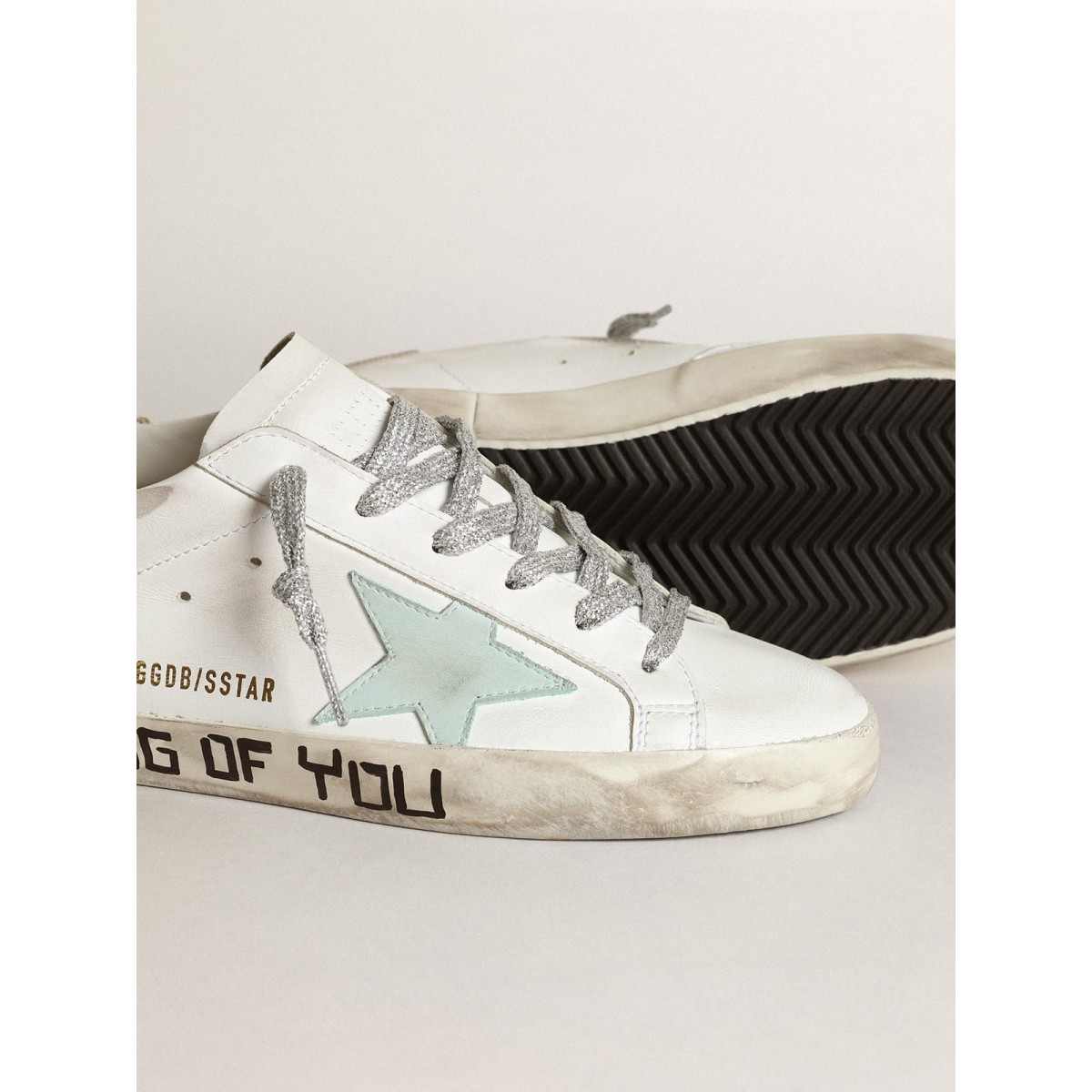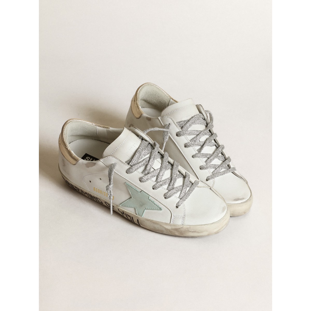 Un’icona senza tempo eppure è in continua evoluzione. A Golden, adoriamo prendere i nostri classici e rielaborarli sempre, sempre da una nuova prospettiva. Questo modello con tomaia in pelle bianca presenta una stella in pelle acquamarina e una linguetta in pelle laminata in platino. Le lettere stampate a schermo nero sulla volpe e sui lacci Lurex d’argento aggiungono il tocco finale.