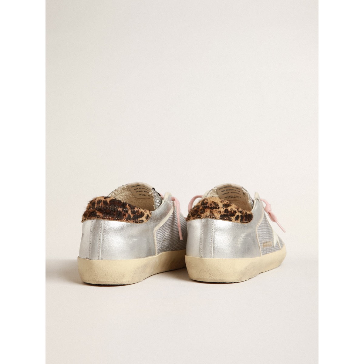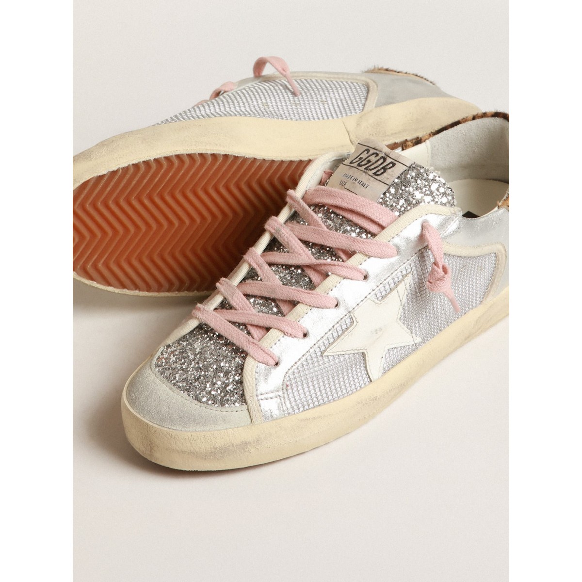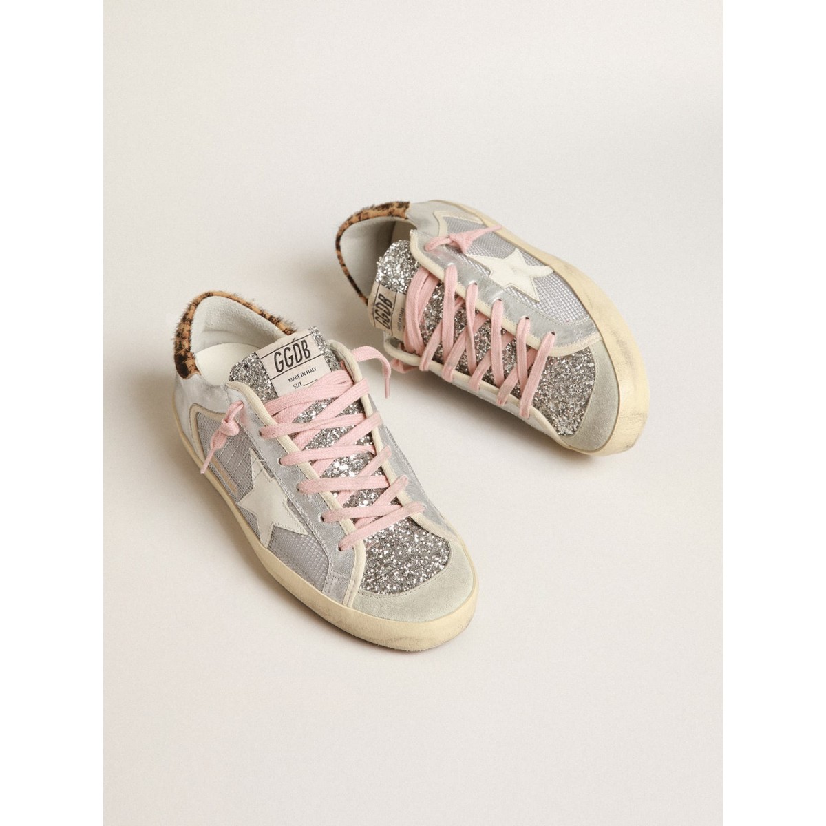 Un’icona senza tempo eppure è in continua evoluzione. A Golden, adoriamo prendere i nostri classici e rielaborarli sempre, sempre da una nuova prospettiva. Queste super-star, con una tomaia in maglia d’argento accentuata da inserti in pelle scamosciata grigio ghiaccio, dispongono di una stella in pelle bianca, una linguetta per la pelle di cavalli da cavallo leopardata e marrone. Gli inserti in pelle laminato d’argento e i lacci rosa aggiungono il tocco finale.