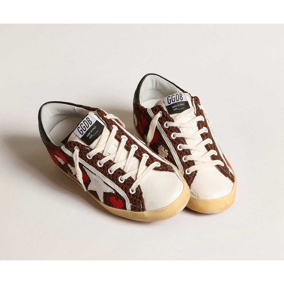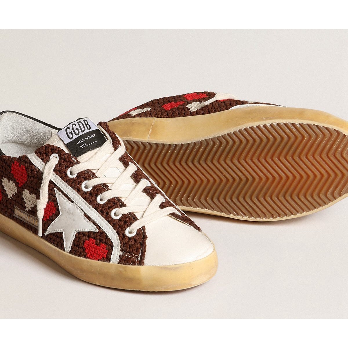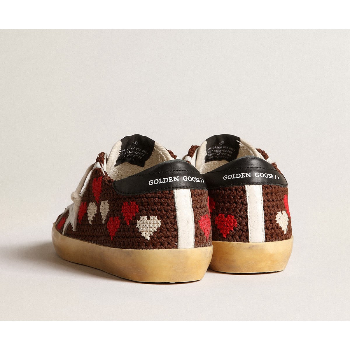 Golden Goose Women’s Super-Star Scarpe Ginnastica Ltd in uncinetto marrone con cuori ricamati e stelle bianca GWF00101.F004294.82205