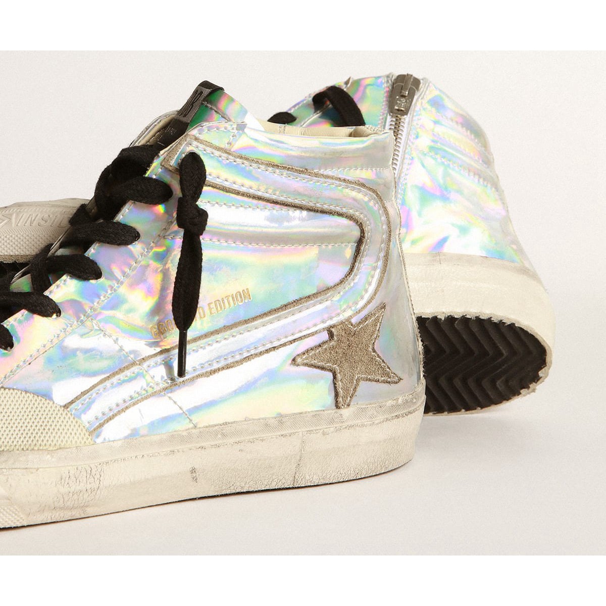Skate Soul, atteggiamento glamour. Le nostre Scarpe Ginnastica da scivolo ti portano direttamente a Venezia Beach, tra un Ollie e un calcio d’inizio. Queste Scarpe Ginnastica da laboratorio maschile in edizione limitata, numerate presentano una tomaia e flash in tessuto d’argento con un effetto olografico, contro il quale si distinguono gli inserti in pelle scamosciata grigio ghiaccio, si distinguono da stelle e flash. La scheda del tallone in gomma bianca con un effetto strutturato che rispecchia la volpe, nonché i lacci neri, aggiungi il tocco finale.