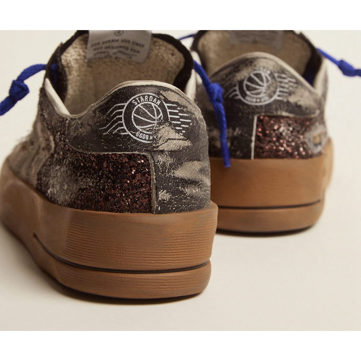 I gloriosi novalli avvolti in una Scarpe Ginnastica. Le Scarpe Ginnastica Stardan rendono omaggio alle icone di basket di quel decennio, tenendo d’occhio il presente. Queste Scarpe Ginnastica da laboratorio femminile in edizione limitata presentano una tomaia glitter marrone scuro e inserti a maglie. E la scheda Black Crackle Leather Star and Heel Aggiungi il tocco finale.