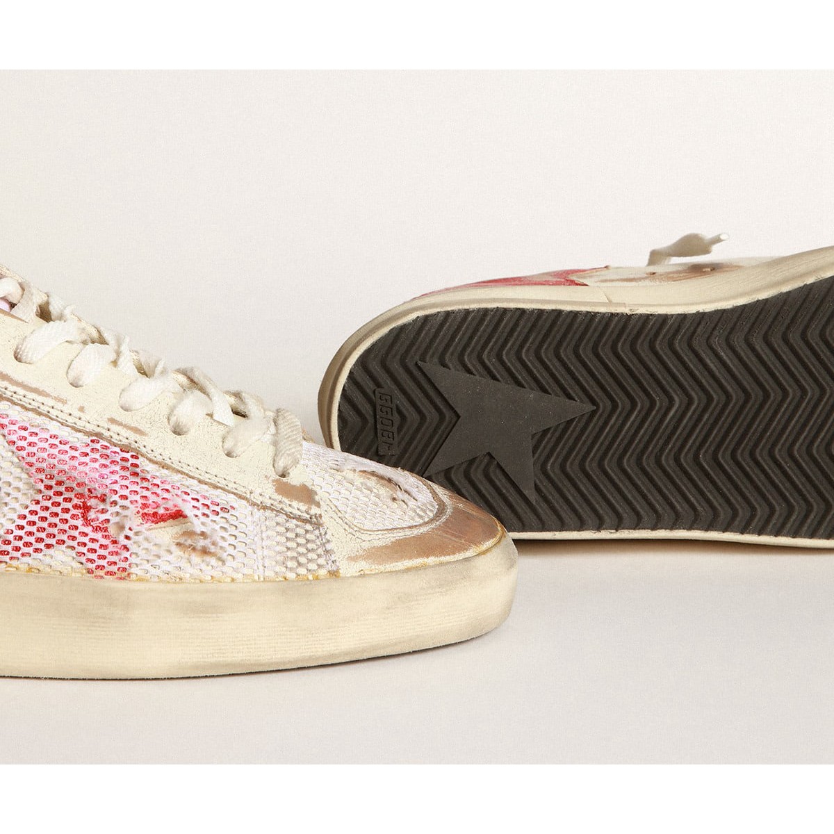 Laboratorio di Scarpe Ginnastica stardan d’oca doratura in pelle bianca e mesh con stella in pelle laminato rosso GWF00128.F003534.10350