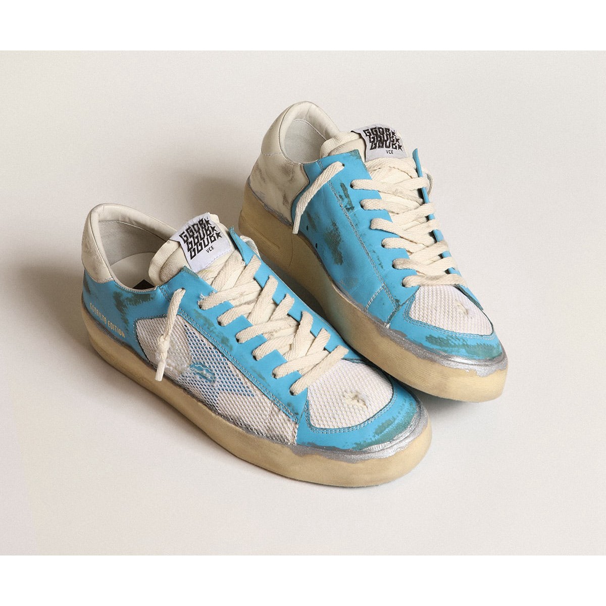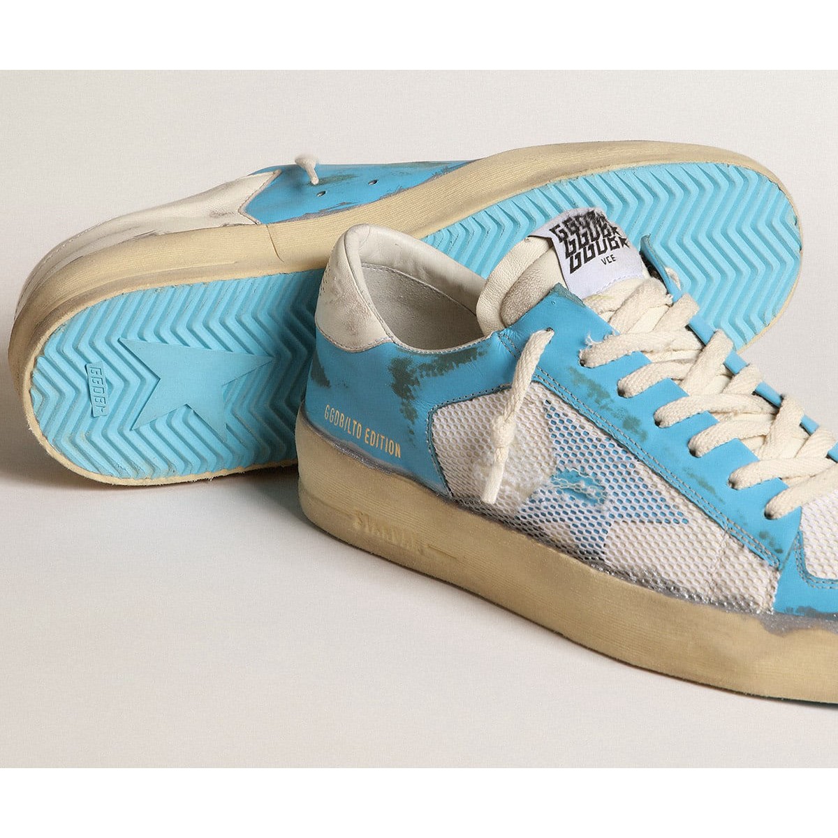 laboratorio di Scarpe Ginnastica stardan maschili d’oca d’oro in pelle nappa azzurra e maglia bianca GMF00370.F004374.50492