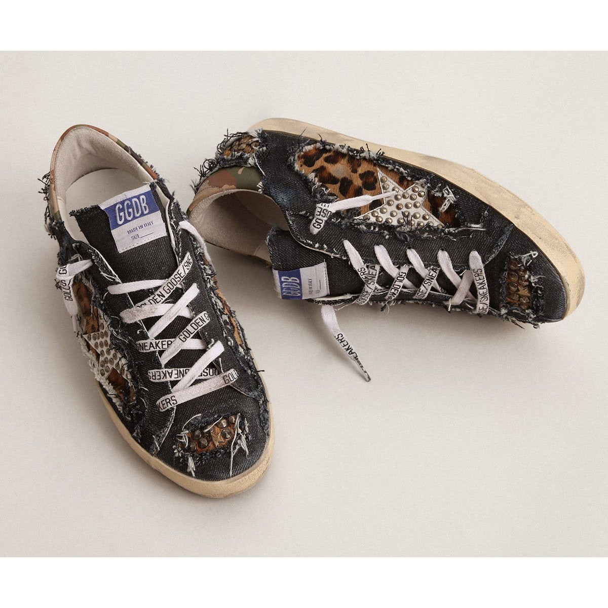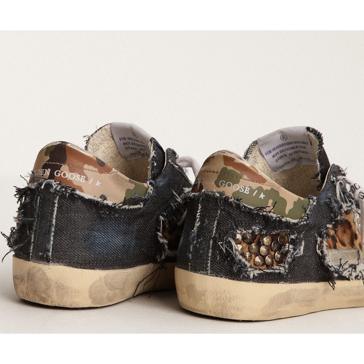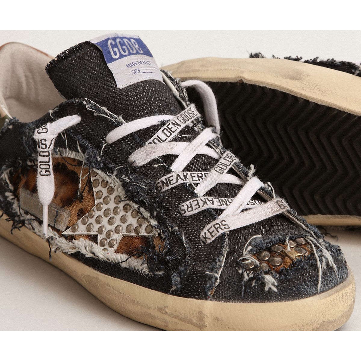 Laboratorio di Scarpe Ginnastica super-star femminili d’oca d’oro in denim e leopardo Pony Skin GWF00103.F002423.81468