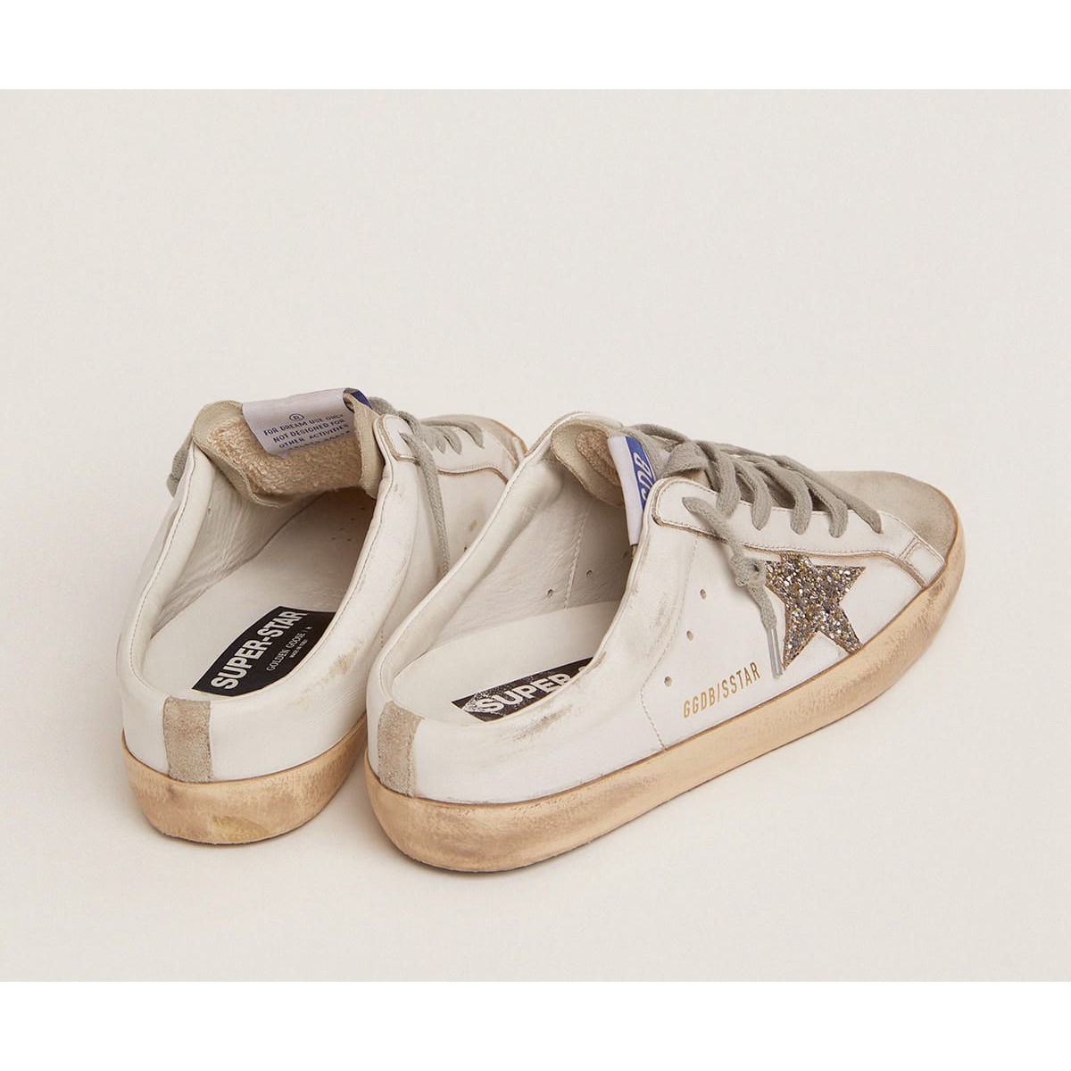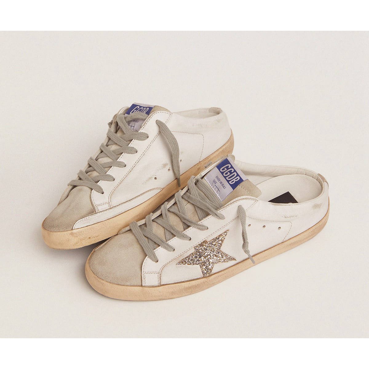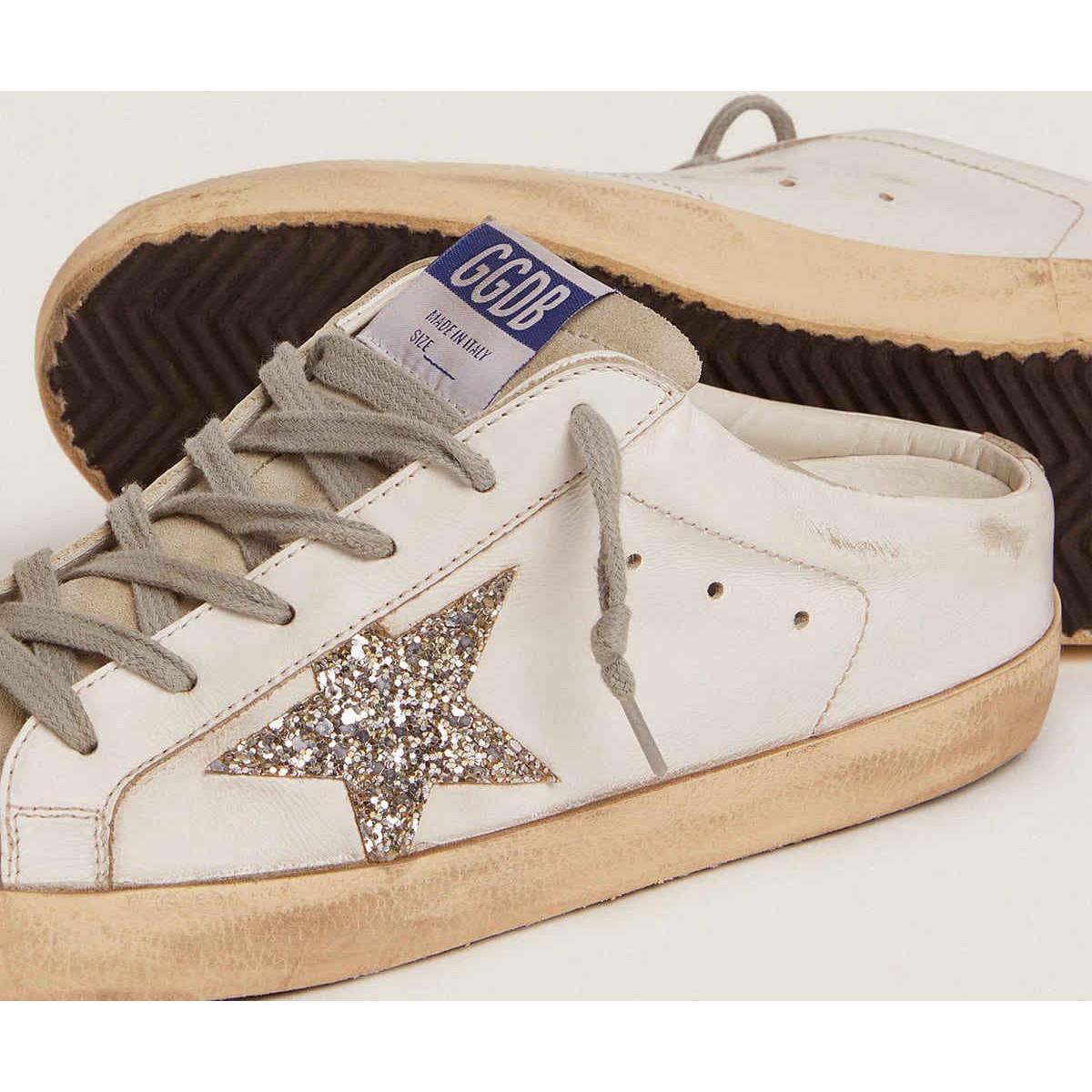 Sabot super-star femminile d’Ora doratura in pelle bianca e pelle scamosciata grigia con stella glitter argentata