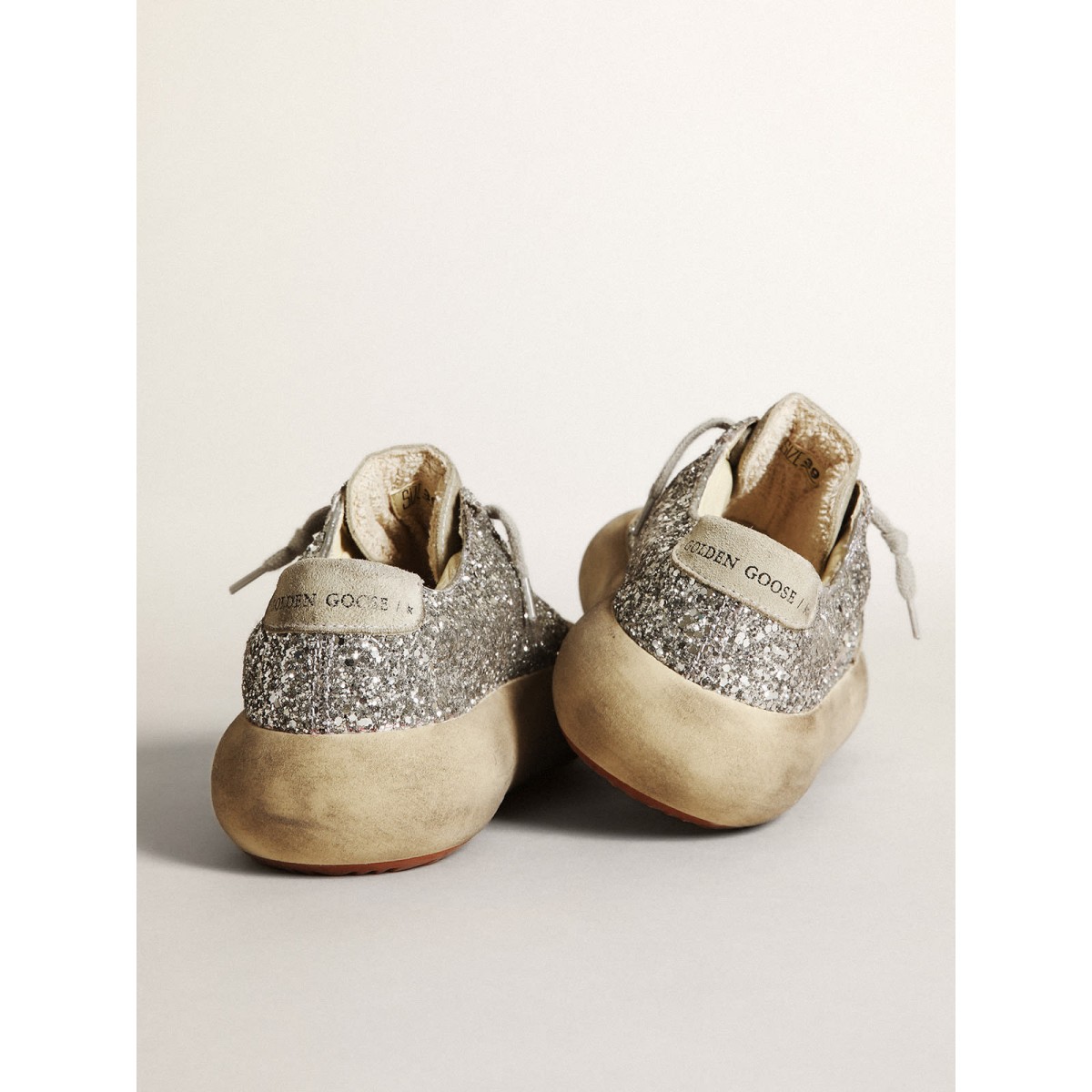 Il tuo nuovo momento per staccarsi dalla realtà e trovare il tuo centro. Il tuo nuovo modo di tornare a te stesso e respirare nella tua leggerezza, volando come mai prima. Le scarpe spaziali accoglienti sono dotate della suola e della soletta imbottita di memory foam, garantendo comfort senza pari a partire dal primo passo. Questo modello, foderato in pelle morbida, presenta una tomaia glitter argentata accentuata da dettagli in pelle scamosciata grigio ghiaccio, tra cui la stella, la linguetta e la lingua del tallone. I lacci dei grigi ghiacciati completano l’aspetto.