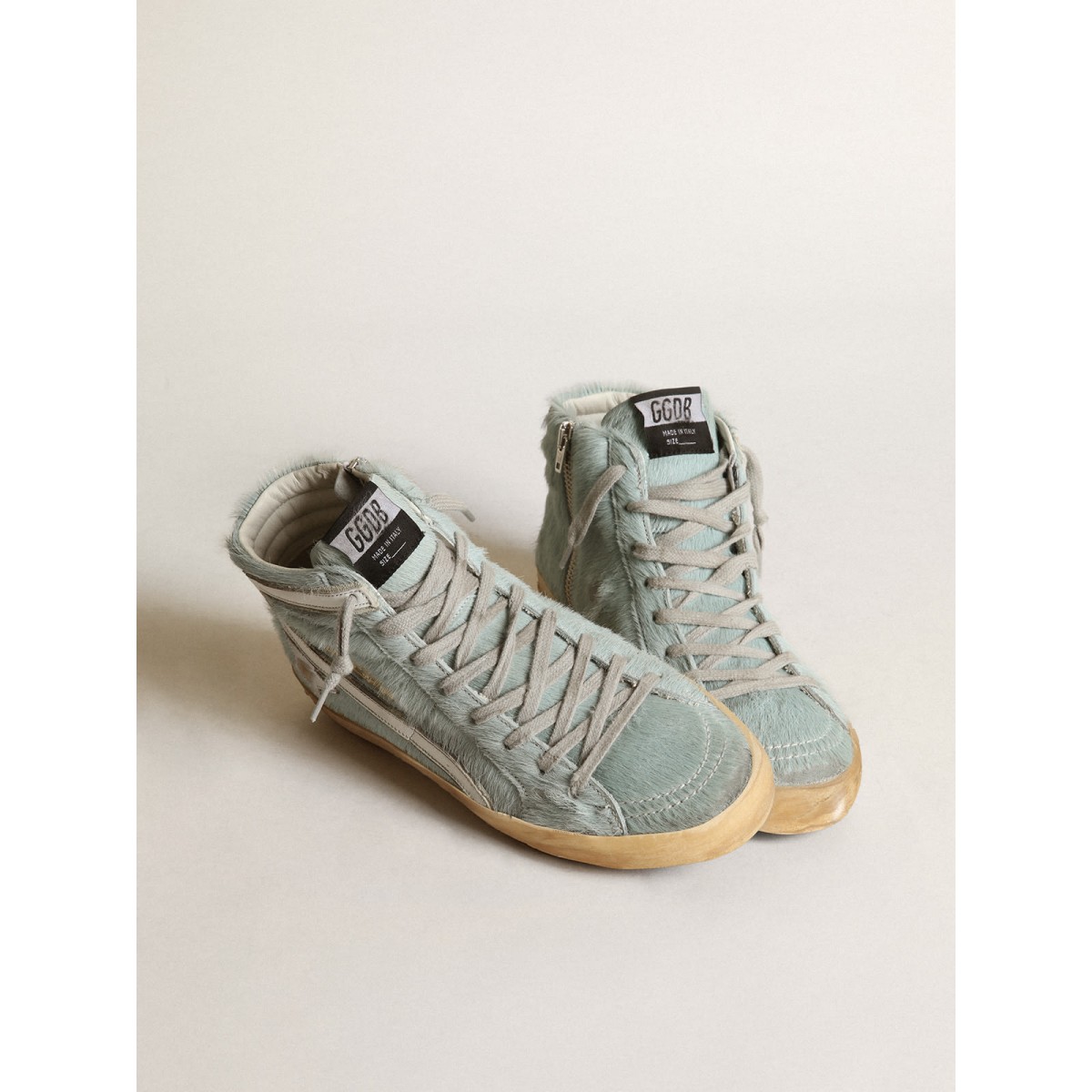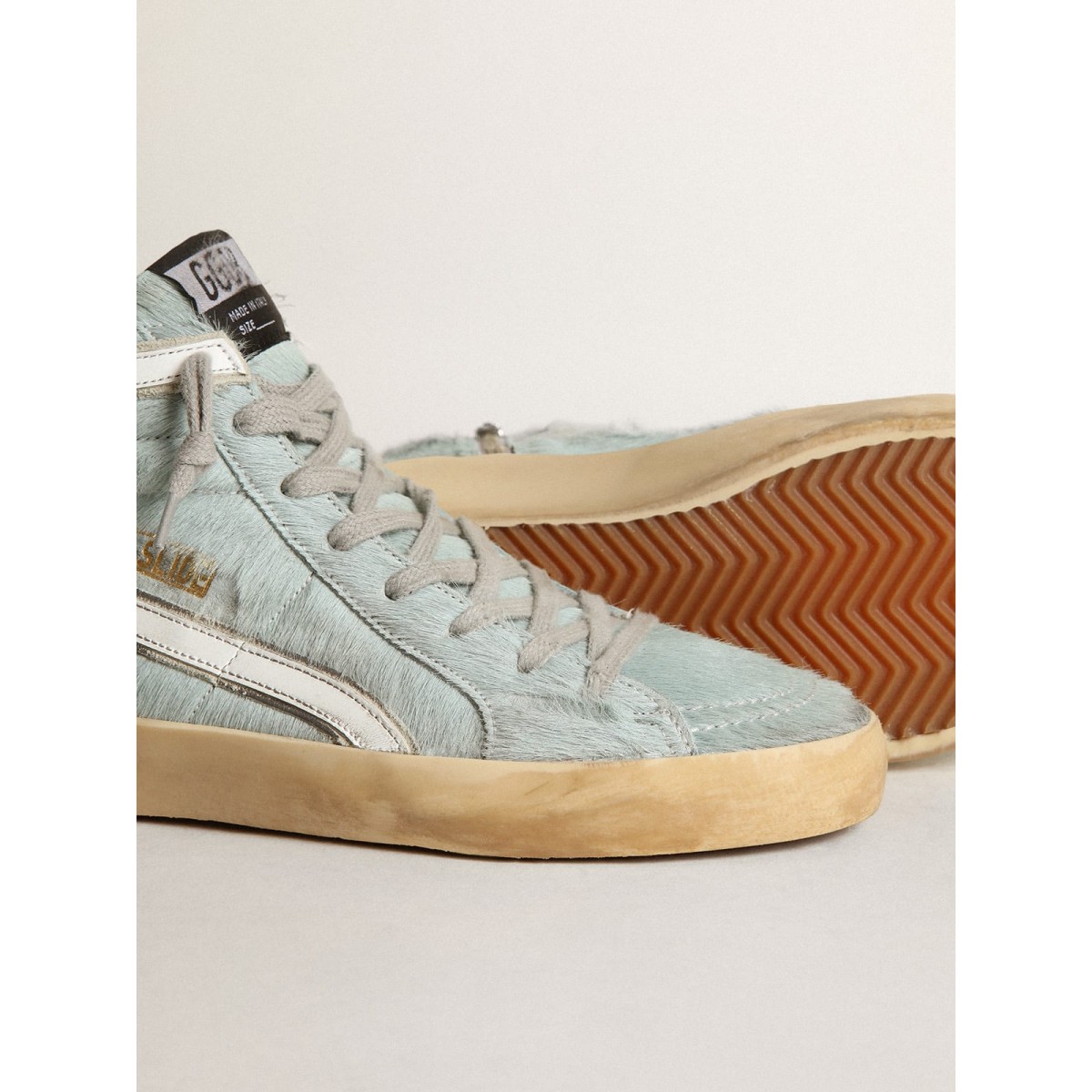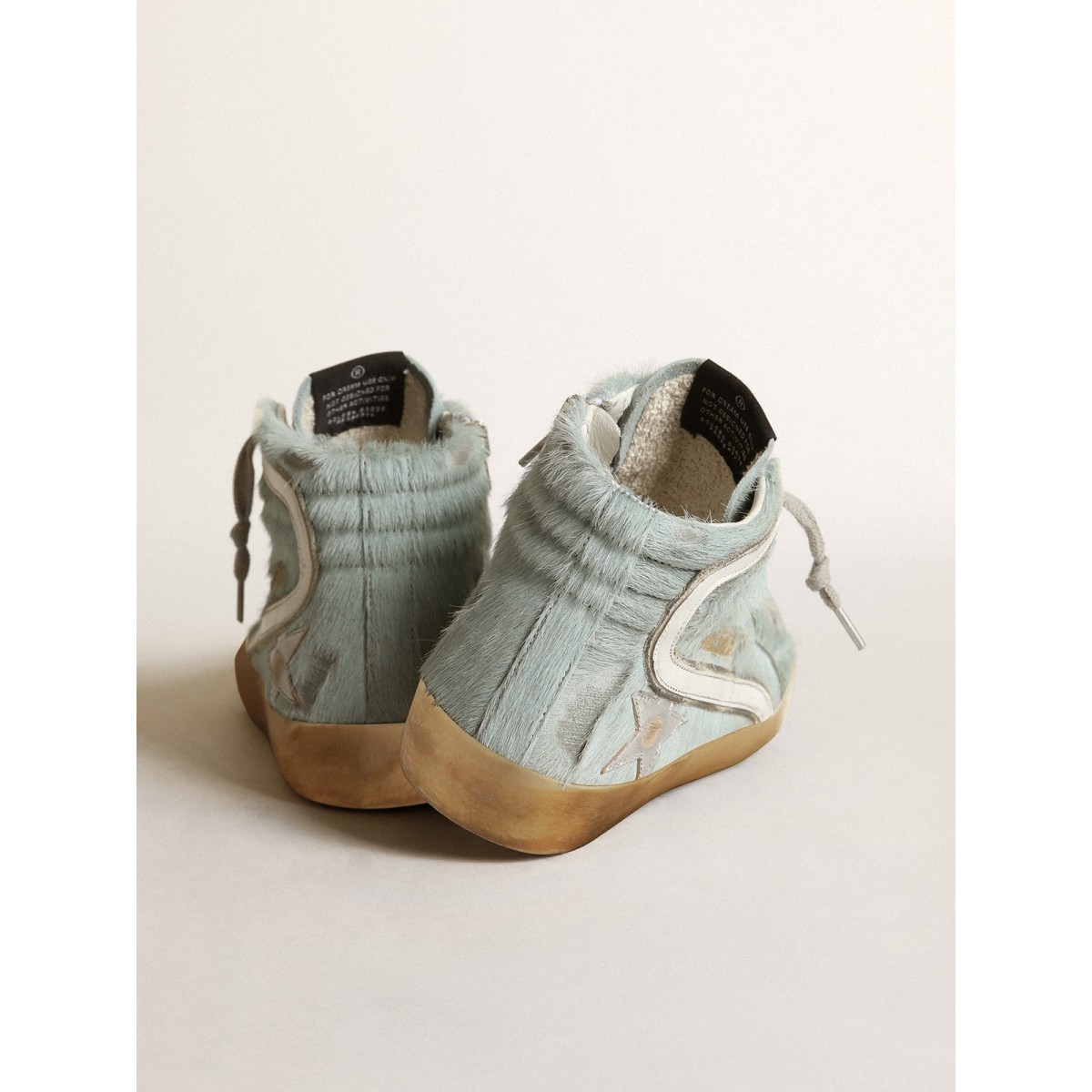 Scarpe Ginnastica a diapositiva d’oca dorata in pelle di cavallo acquamarina con stella in pelle laminato in argento GWF00115.F003439.50713