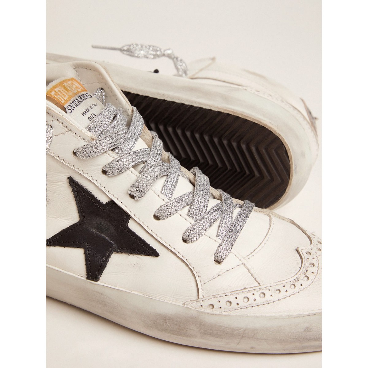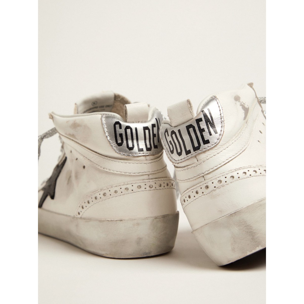 Un look casual ma trasuda l’eleganza streetwear: un modello che interpreta lo stile dell’oca d’oro grazie all’uso di trattamenti e finiture esclusive. Queste scarpe da ginnastica a medio stella dispongono di una tomaia in pelle bianca, scheda del tallone laminata e stella nera.