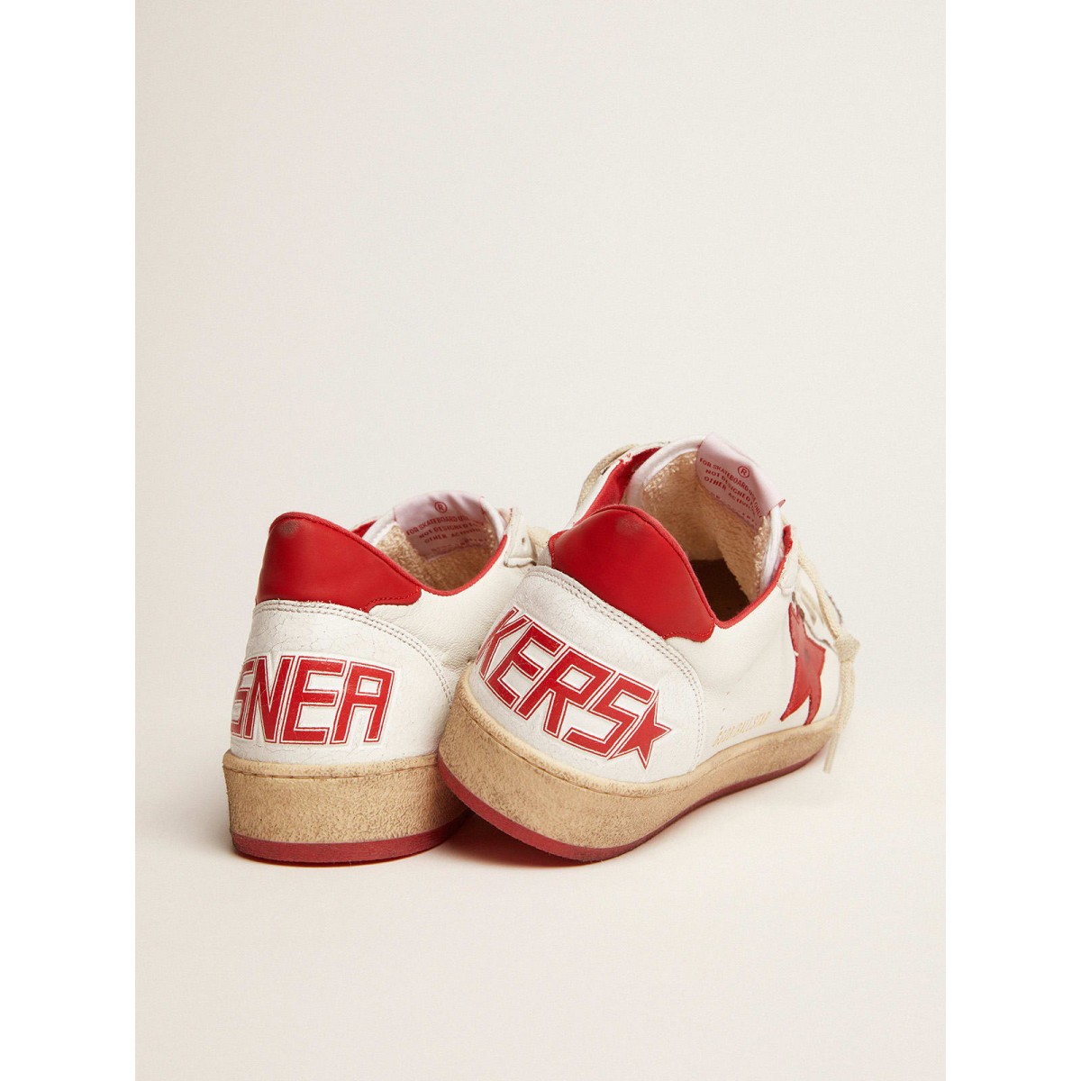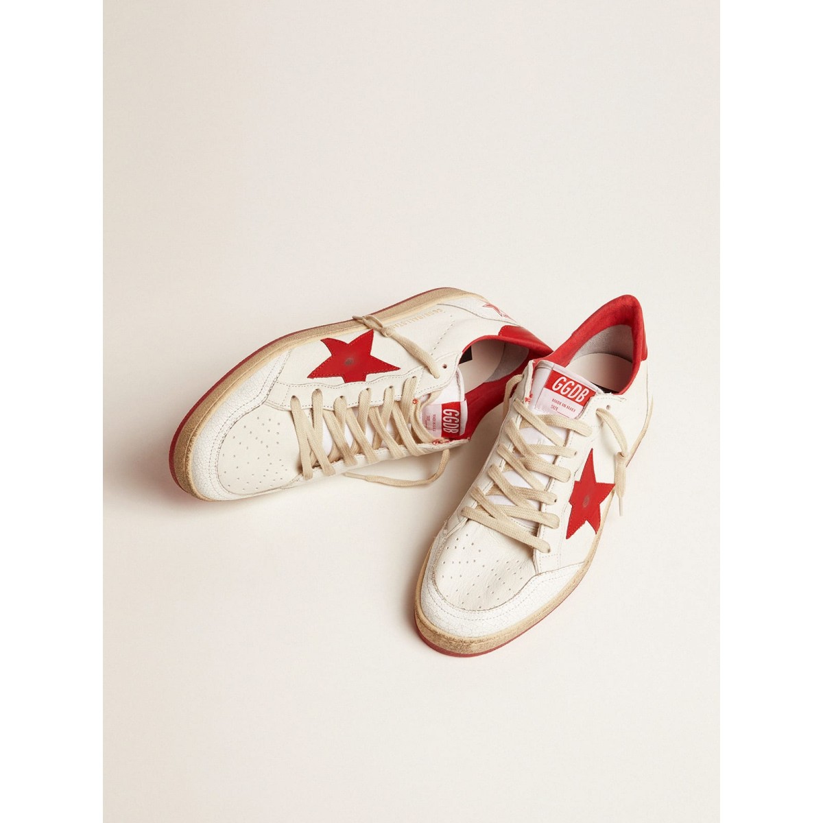 Sognando gli anni Ottanta. Le nostre Scarpe Ginnastica a stella della palla hanno un’atmosfera universitaria americana catturata tra un tiro a cerchio e un giro di skateboard. Questo modello con tomaia in pelle bianca presenta una scheda stella e tacco GGDB rossa.