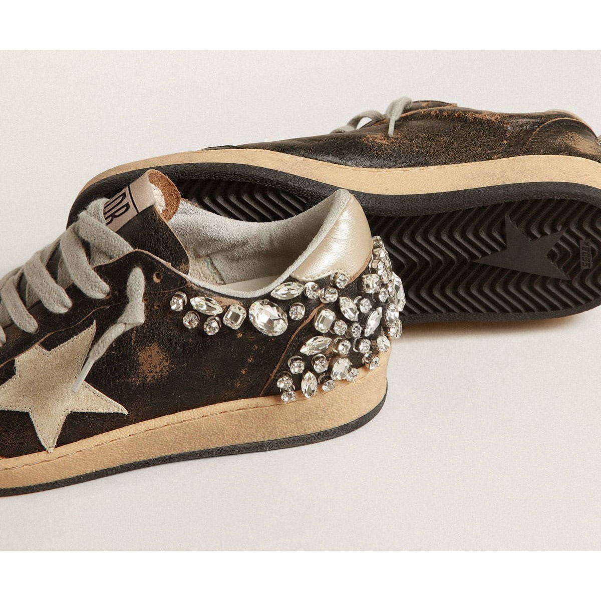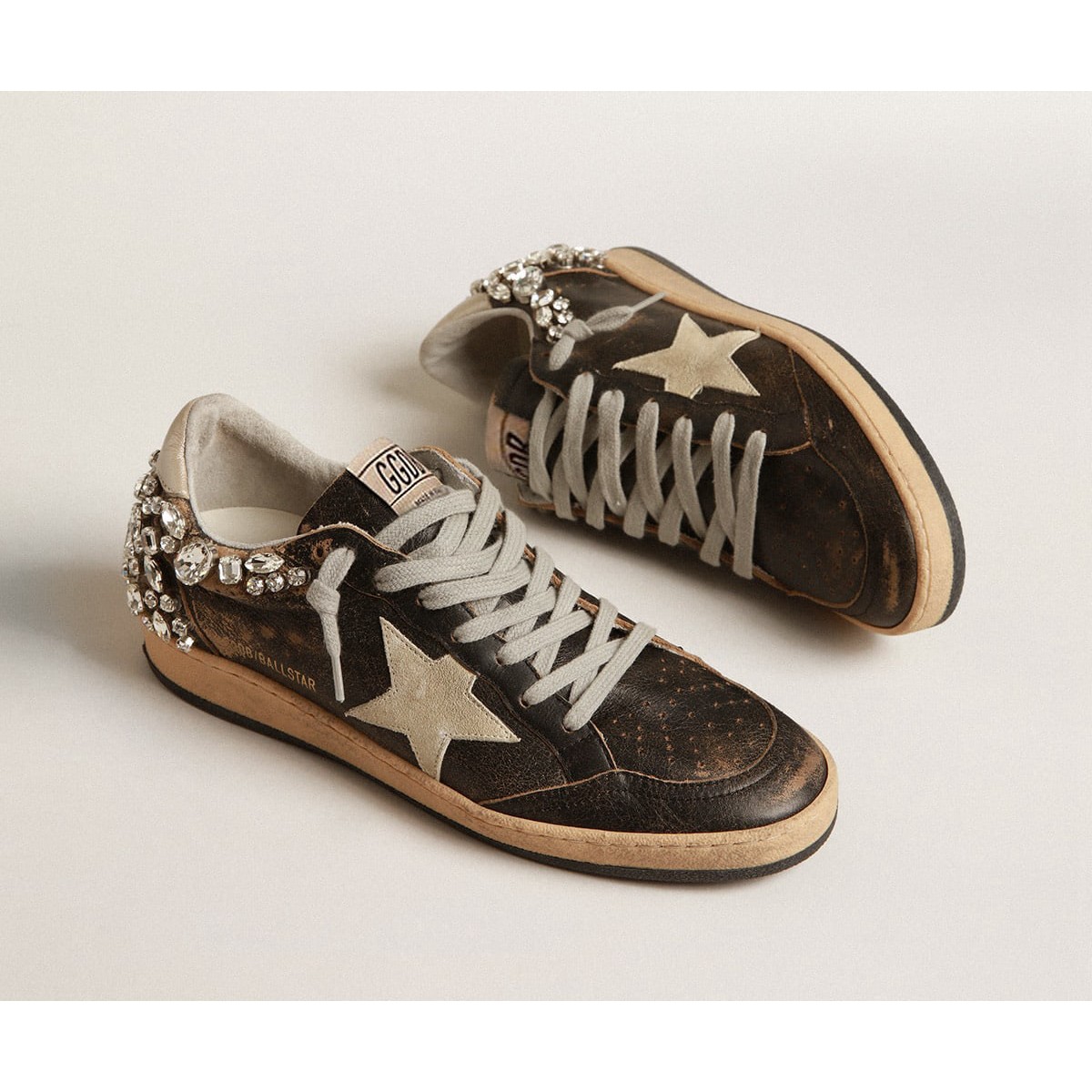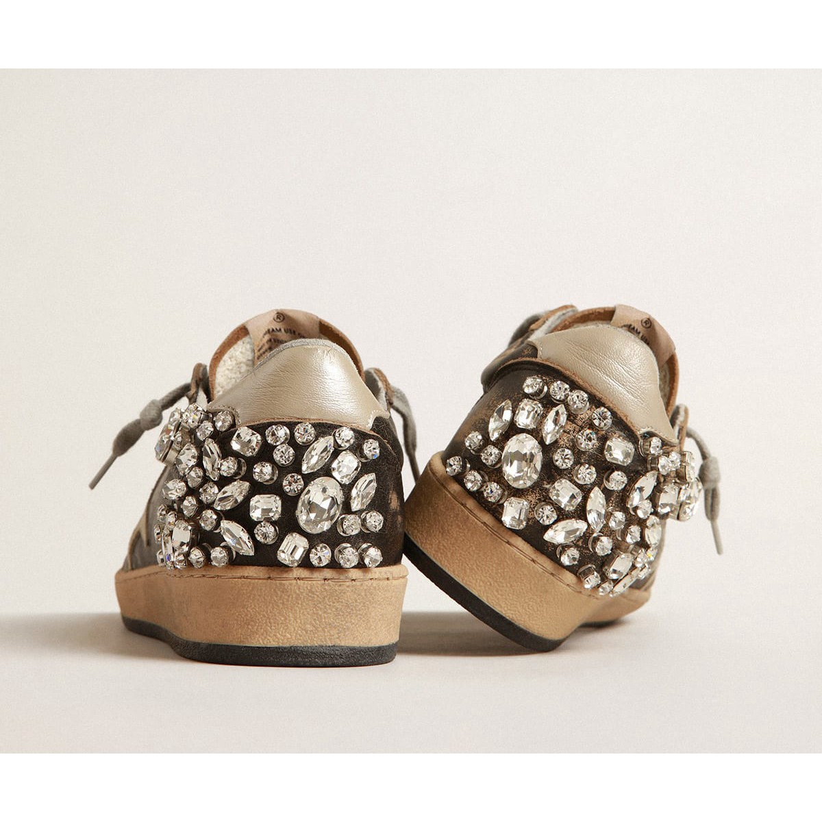 Sognando degli anni Ottanta. Le nostre Scarpe Ginnastica a stella della palla hanno un’atmosfera universitaria americana catturata tra un tiro a cerchio e un giro di skateboard. Questo modello in pelle nera presenta una stella in pelle scamosciata color sabbia e una linguetta con tacco avorio in pelle Nappa ad effetto laminato. La decorazione cristallina sul retro e sui lacci grigi ghiacciati aggiungono il tocco finale: cose belle che non passano mai di moda.