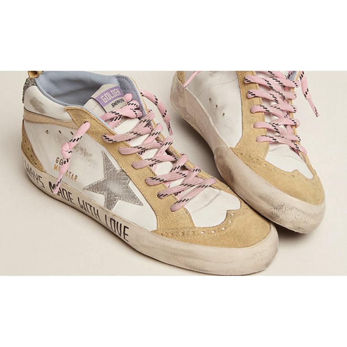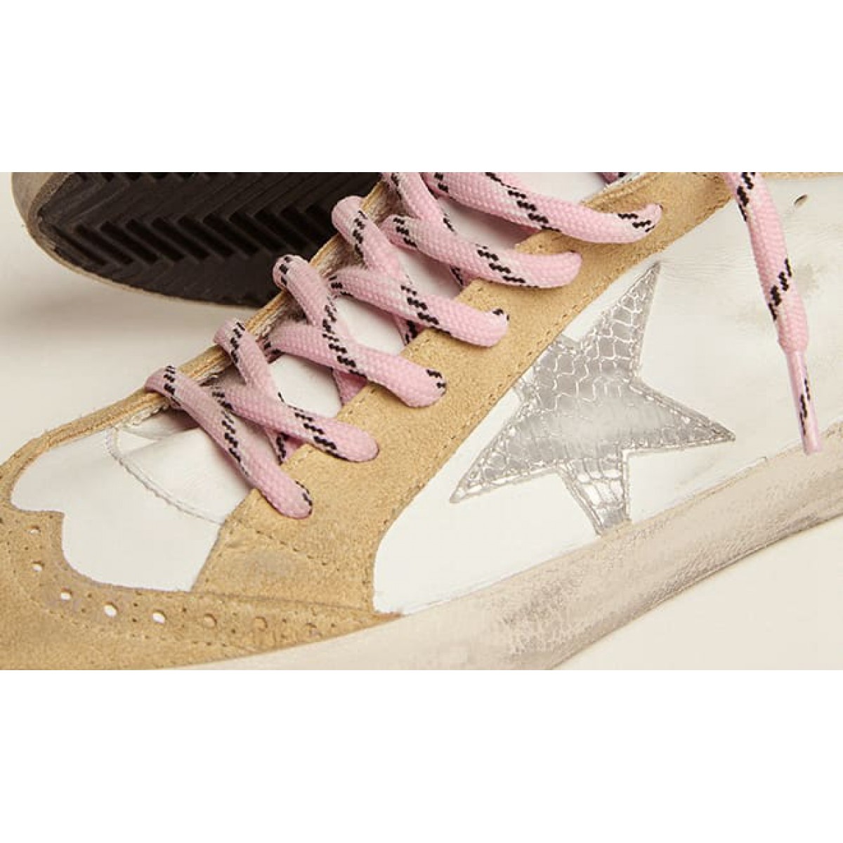 Versatilità unicamente elegante: le Scarpe Ginnastica a livello medio prendono una raffinata raffinata raffinata raffinata raffinata raffinata raffinata raffinata raffinata raffinata raffinata raffinata Approccio alla loro ispirazione per la scena di pattinaggio degli anni ’80. Questo modello con una tomaia in pelle bianca presenta una stella in pelle metallica con stampa di serpenti argento e un flash in pelle con stampa a serpente crema. La scheda del tallone glitter d’argento, inserti in pelle scamosciata color sabbia con broging e lacci rosa con motivo a strisce in bianco e nero completa il look.