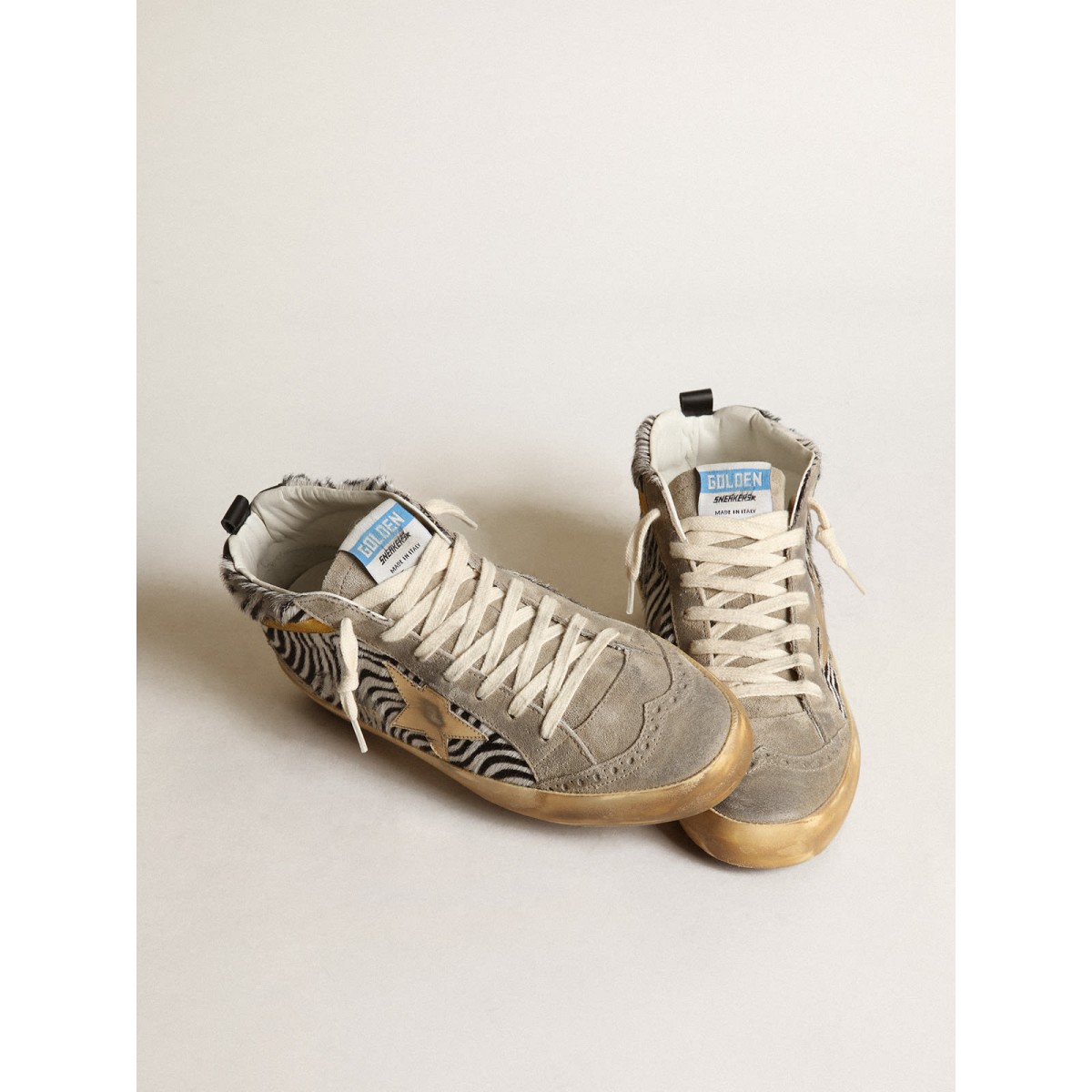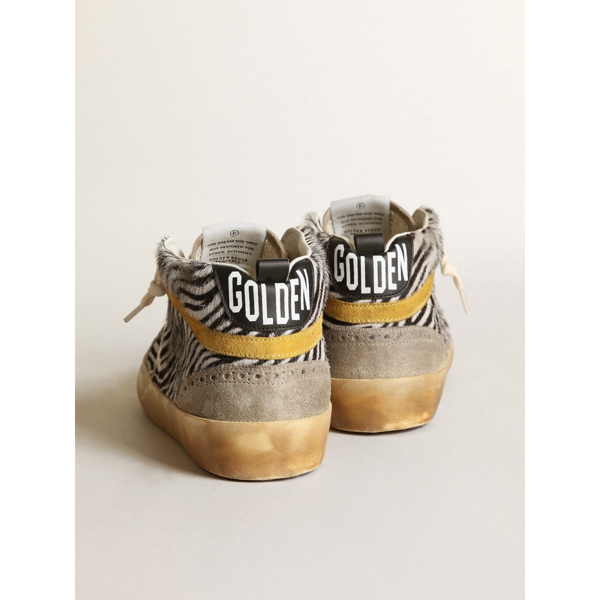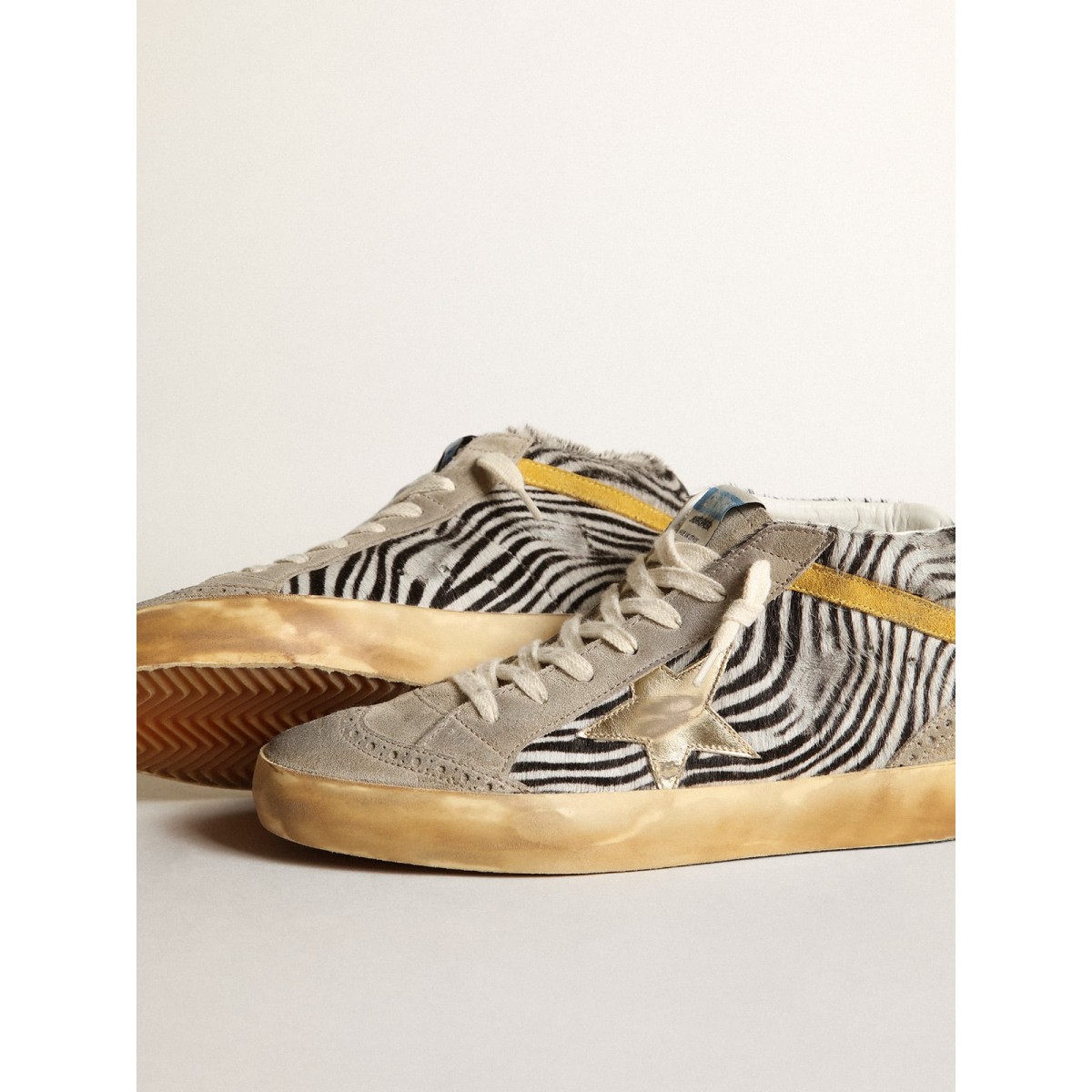 Versatilità univoco elegante: le Scarpe Ginnastica a metà stella adottano un approccio raffinato alla loro ispirazione per la scena di pattinaggio degli anni ’80. Con una tomaia di pony con stampa zebra in bianco e nero, queste scarpe da ginnastica presentano una stella in pelle metallica dorata, una linguetta in pelle nera e un flash in pelle scamosciata color senape. Gli inserti in pelle scamosciata colomba-grigio, i dettagli di broghire e i lacci color crema completano il look.