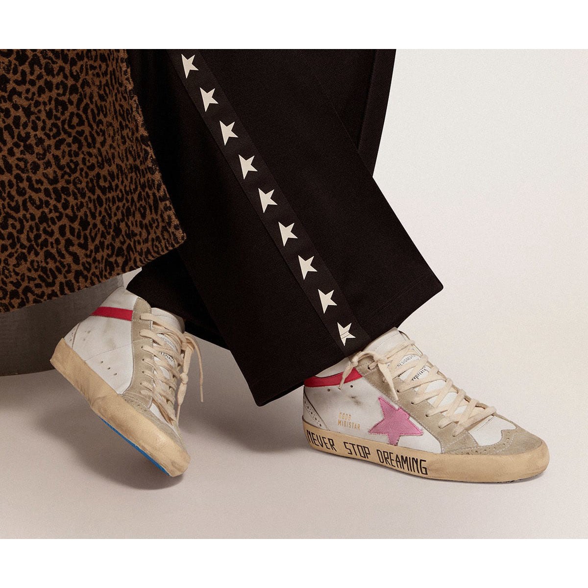 Versatilità unicamente elegante: le Scarpe Ginnastica a livello medio adottano un approccio raffinato raffinato alla loro ispirazione per la scena di pattinaggio degli anni ottanta. Questo modello, con una tomaia in pelle bianca, presenta un flash in pelle rosa brillante, stella di tela rosa e tacco in pelle laminato in argento. And the ice-gray suede inserts and black Never Stop Dreaming lettering on the foxing add a stylish finishing touch.