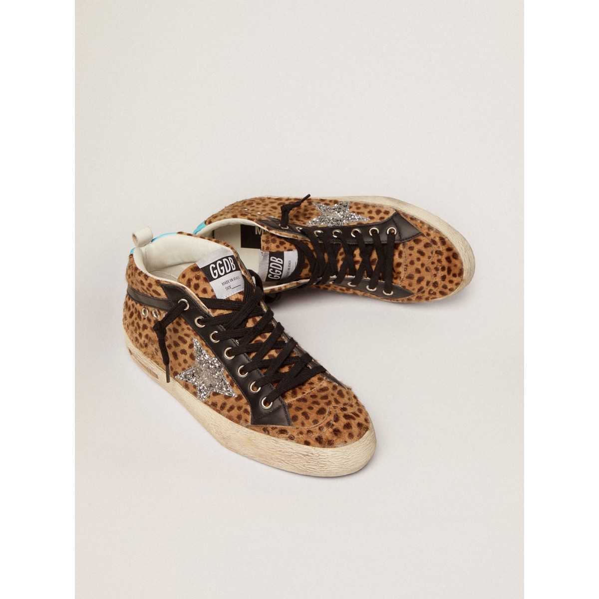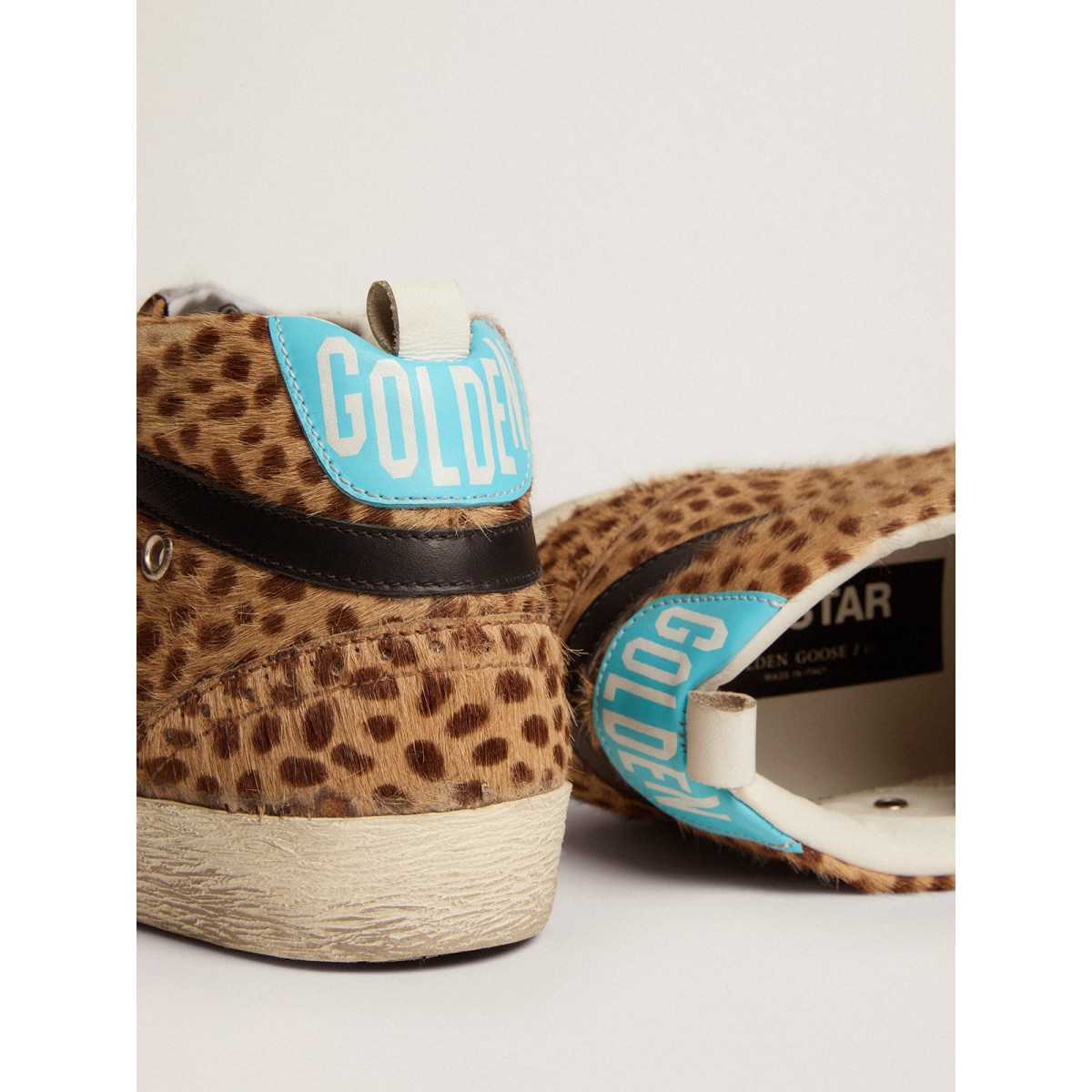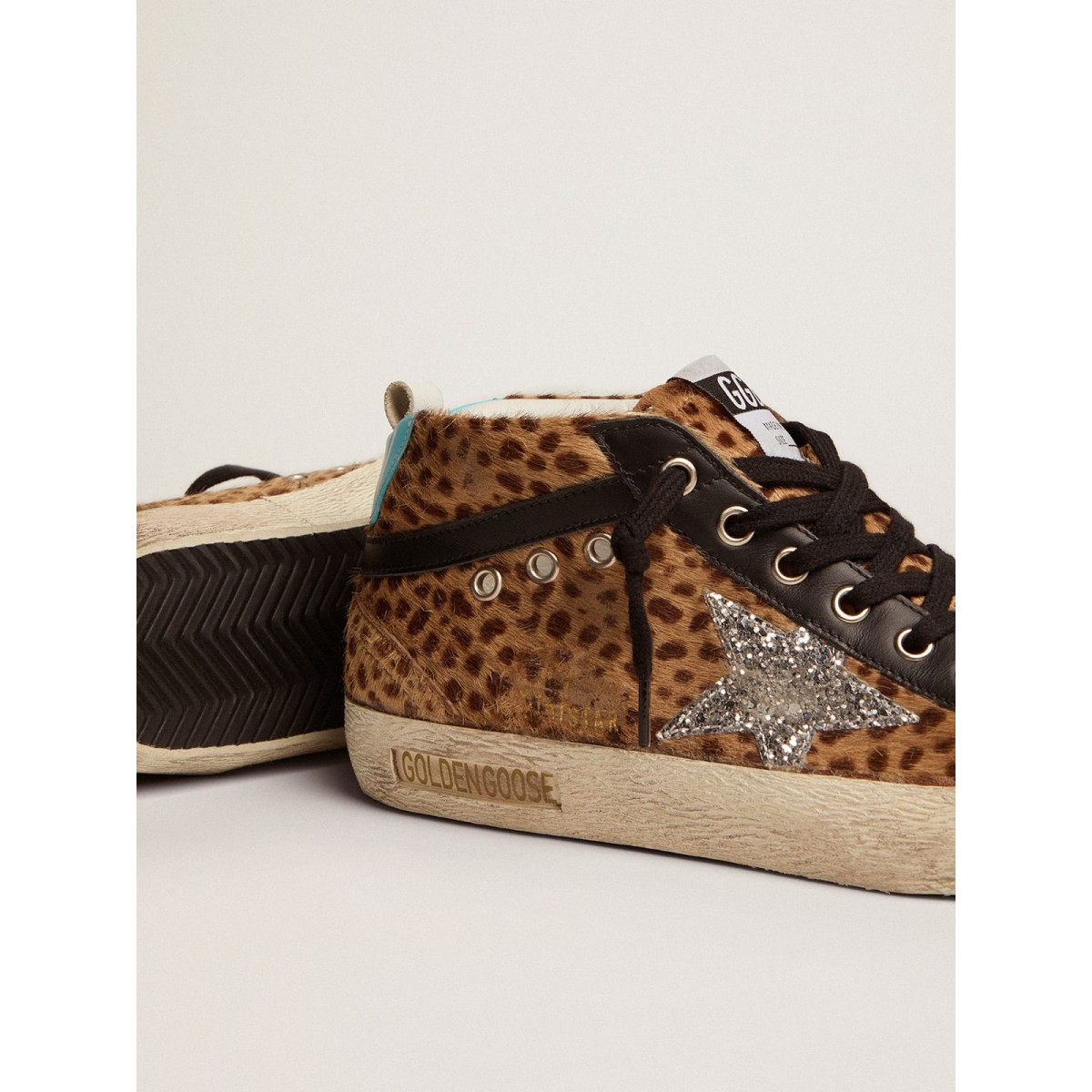 Versatilità univoco elegante: le Scarpe Ginnastica a metà stella adottano un approccio raffinato alla loro ispirazione per la scena di pattinaggio degli anni ’80. Queste scarpe da ginnastica con una tomaia di pony beige e marrone con stampa animale presentano una stella glitter d’argento e una linguetta di tacco in pelle azzurro. Un flash in pelle nera e lacci neri completano il look.