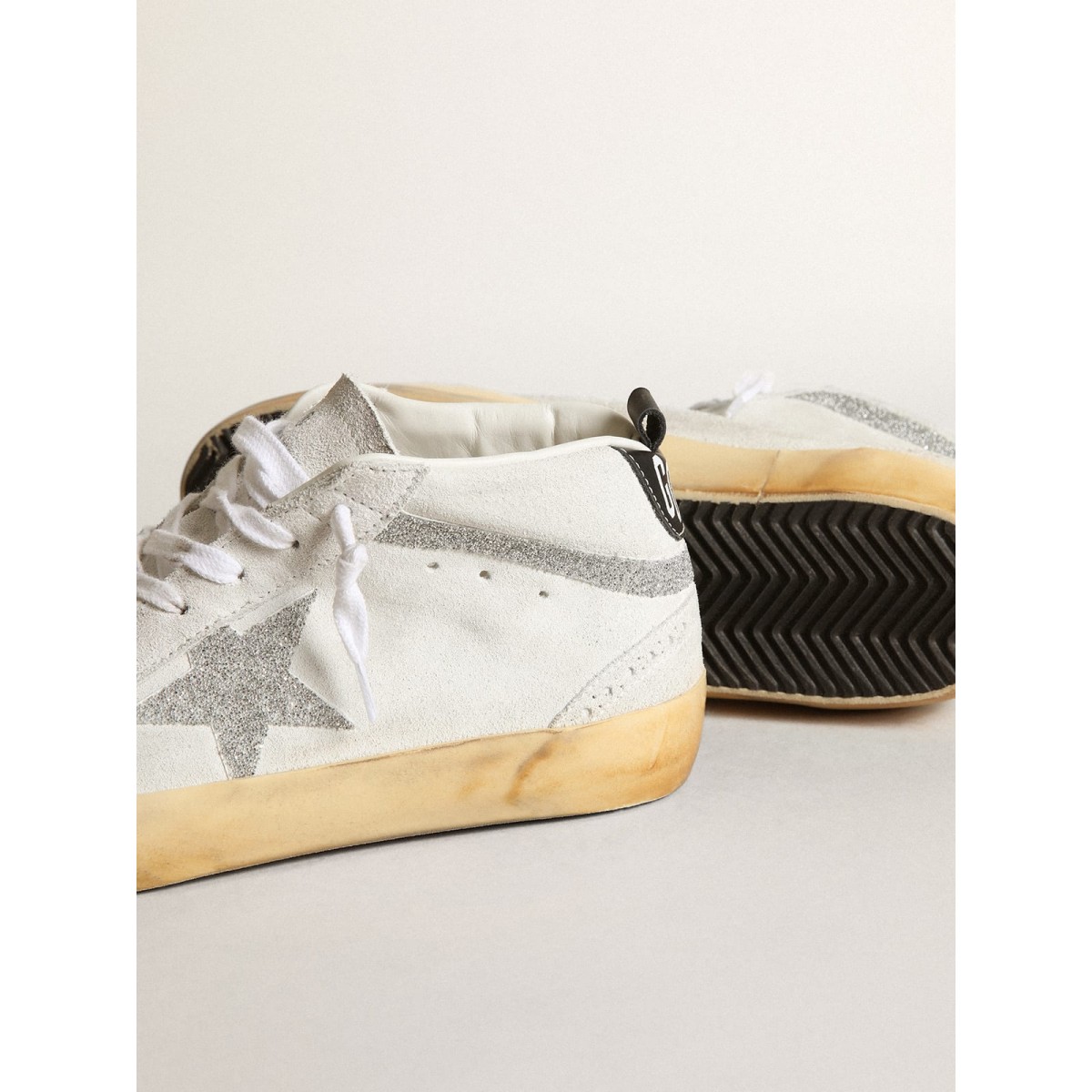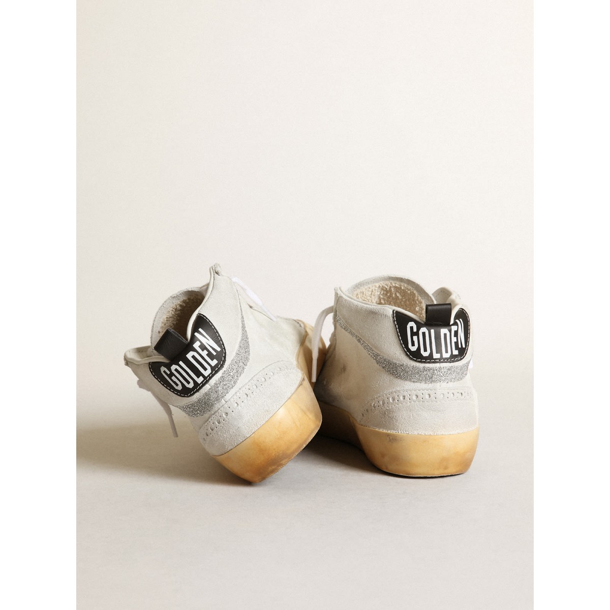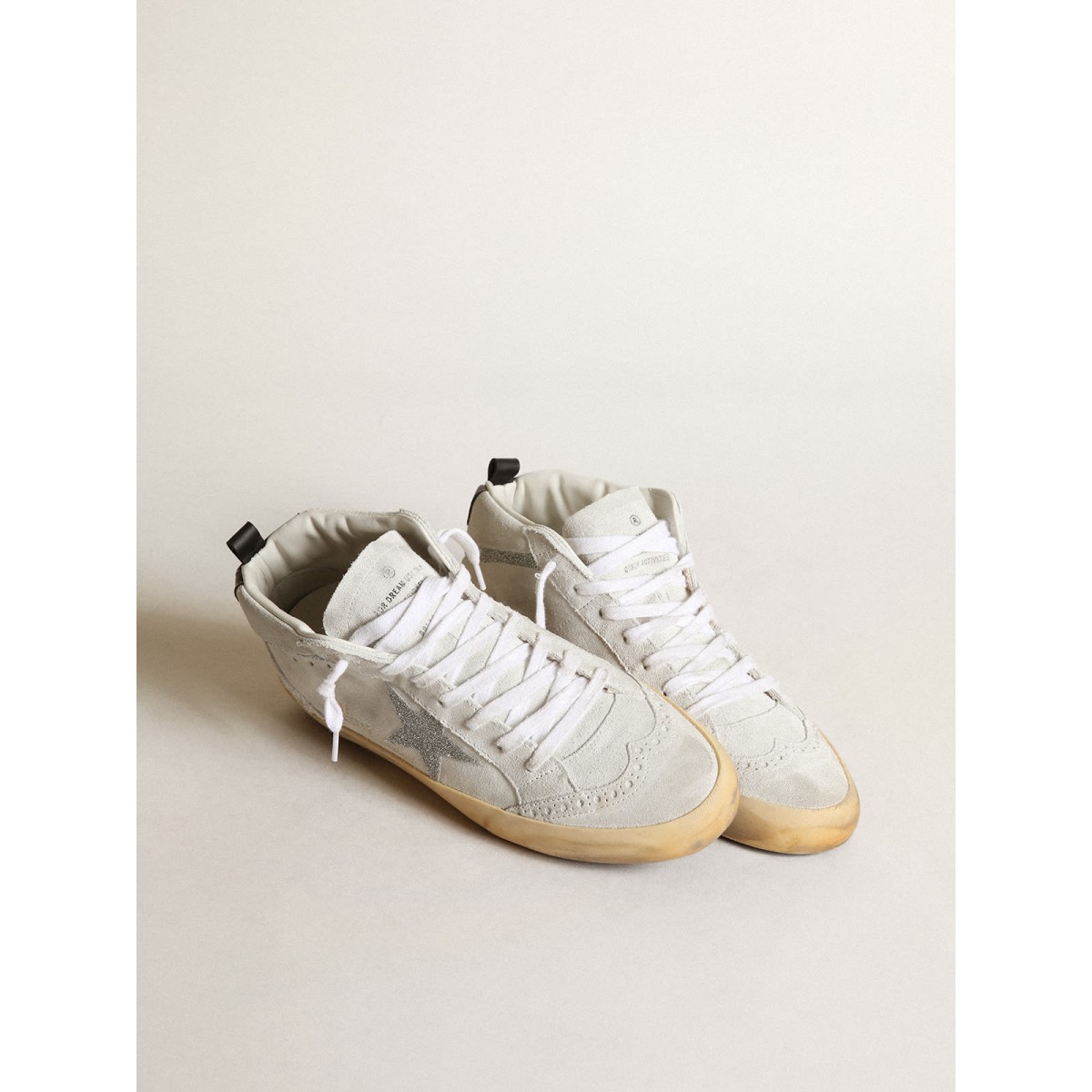 Versatilità univoco elegante: le Scarpe Ginnastica a metà stella adottano un approccio raffinato alla loro ispirazione per la scena di pattinaggio degli anni ’80. Queste scarpe da ginnastica con una tomaia in pelle scamosciata bianca presentano una stella e flash in micro-cristalli Swarovski di colore argento. La scheda del tallone in pelle nera, i dettagli di broghire e i lacci bianchi completano il look.