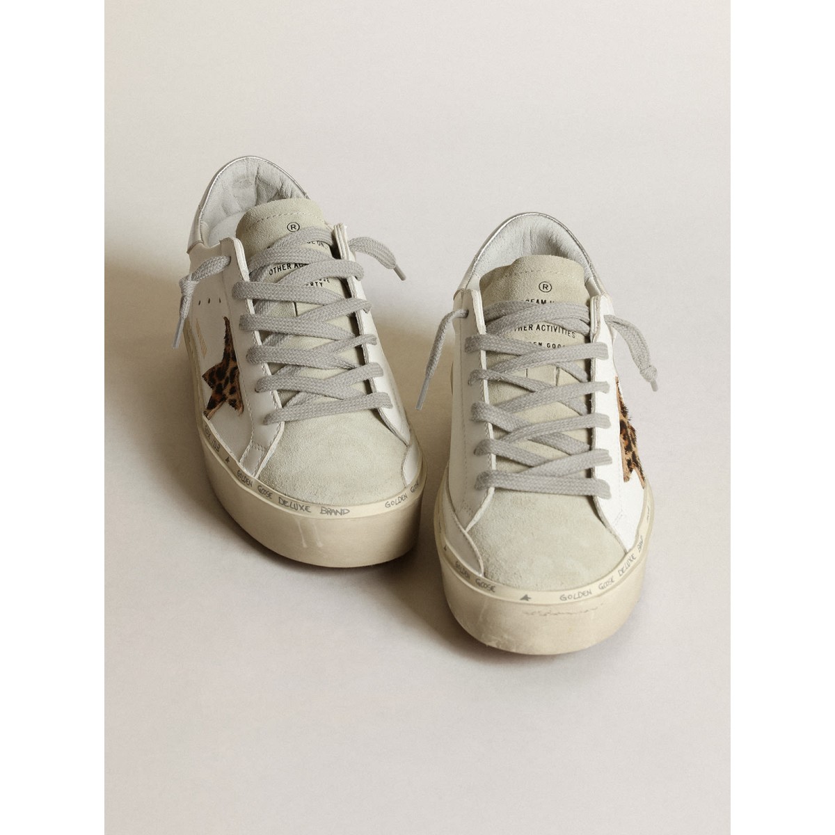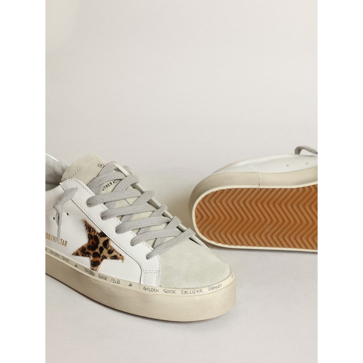 Doppia altezza e design iconico: ispirati alle nostre Scarpe Ginnastica super stelle, le Scarpe Ginnastica Hi Star presentano doppia volpe, abbellite con lettere a mano. Questo modello in pelle bianca presenta una stella della pelle di pony con stampa leopardata in beige e marrone e una linguetta metallica in pelle metallizzata. La lingua in pelle scamosciata e grigio ghiaccio di ghiaccio aggiungono il tocco finale.