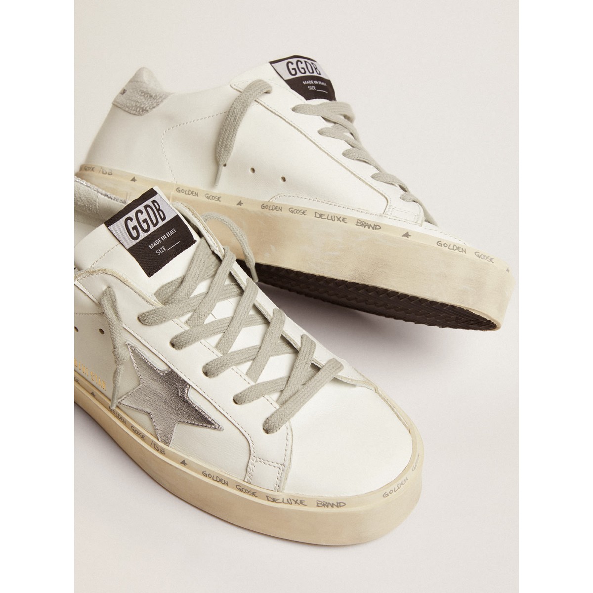 Doppia altezza e design iconico: i nostri hi-stars adottano la stessa tomaia della superstar, ma trovano la loro identità grazie alla doppia volpe sulla suola. Questa versione presenta la stella che si coordina con la scheda Metallic Silver Heel, con lettere raffinate scritte a mano lungo il bordo della piattaforma.