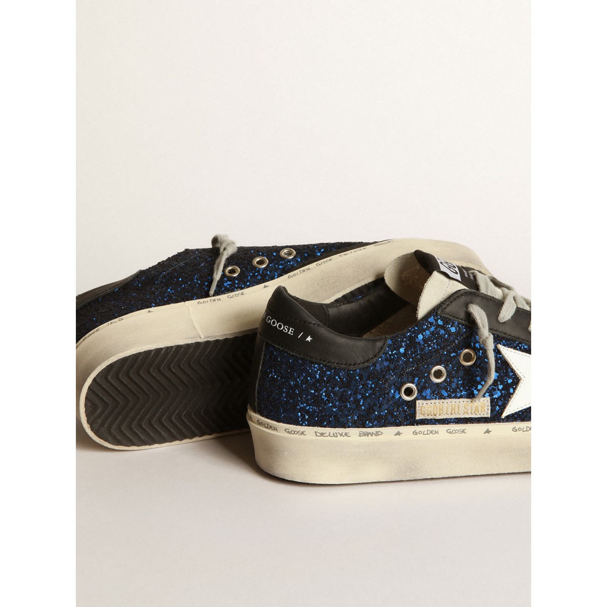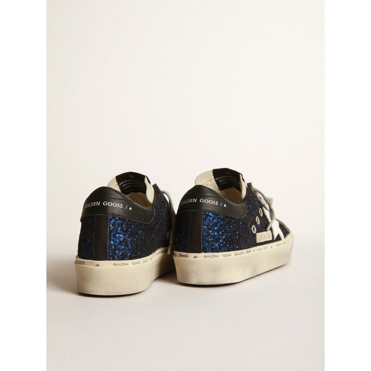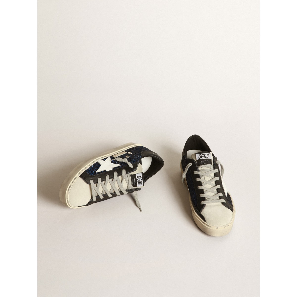 Abbiamo preso il design iconico del modello superstar e lo abbiamo aggiornato per creare un nuovo classico. HI Stars ha una piattaforma speciale fatta con doppia volpe che esprime il concetto di artigianato con le sue lettere scritte a mano. Questo modello ha una tomaia in pelle scamosciata e glitter blu, combinata con una star GGDB bianco e una scheda del tallone nero.