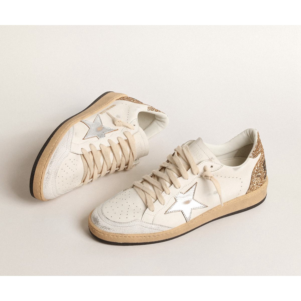 Sogni degli anni Ottanta. Le nostre Scarpe Ginnastica a stella della palla hanno un’atmosfera universitaria americana catturata tra un tiro a cerchio e un giro di skateboard. Questo modello con una tomaia in pelle bianca presenta una stella in pelle metallica d’argento e una linguetta del tallone glitter dorato. La punta in pelle bianca e i lacci color crema aggiungono il tocco finale: cose belle che non passano mai di moda.