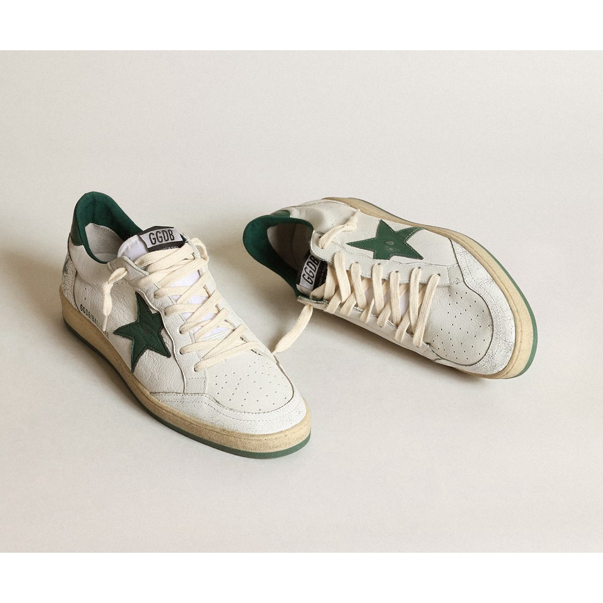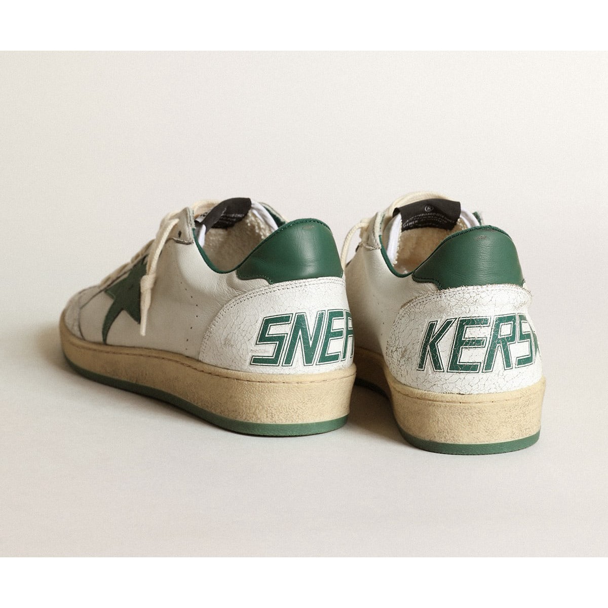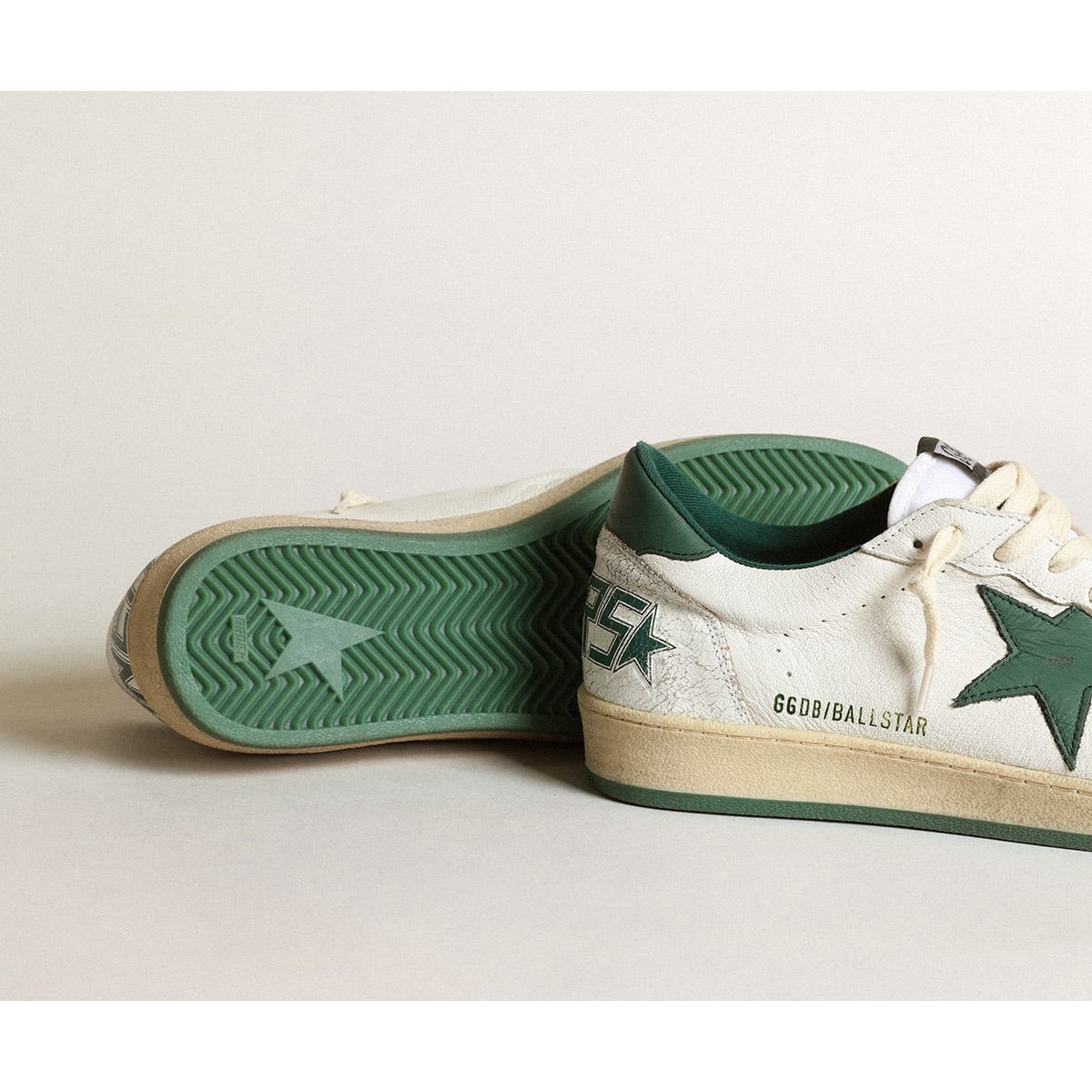 Sogni degli anni Ottanta. Le nostre Scarpe Ginnastica a stella della palla hanno un’atmosfera universitaria americana catturata tra un tiro a cerchio e un giro di skateboard. Questo modello femminile, con una tomaia in pelle bianca, presenta una linguetta a stella e tacco in dettagli in pelle verde e crackle bianca, come la punta e l’inserto sul retro. A green sole and cream-colored laces add the finishing touch: beautiful things that never go out of fashion.