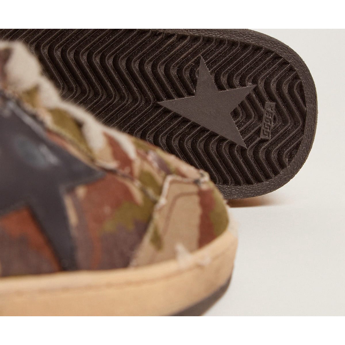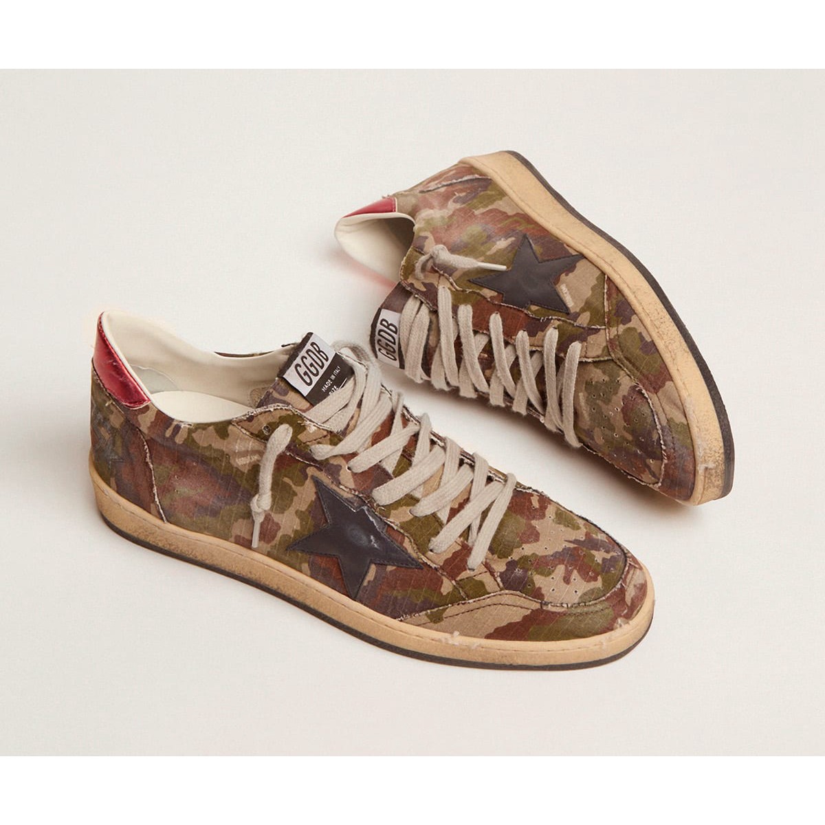 Sogni degli anni ’80. Le nostre Scarpe Ginnastica a stella della palla hanno un’atmosfera universitaria americana catturata tra un tiro a cerchio e un giro di skateboard. Questo modello, con una tomaia in tessuto RIPSTOP a stampa mimetica verde, presenta una stella in pelle blu di mezzanotte e una linguetta in pelle laminata rossa. I lacci dei grigi ghiacciati completano l’aspetto.