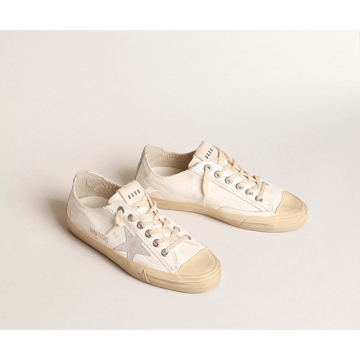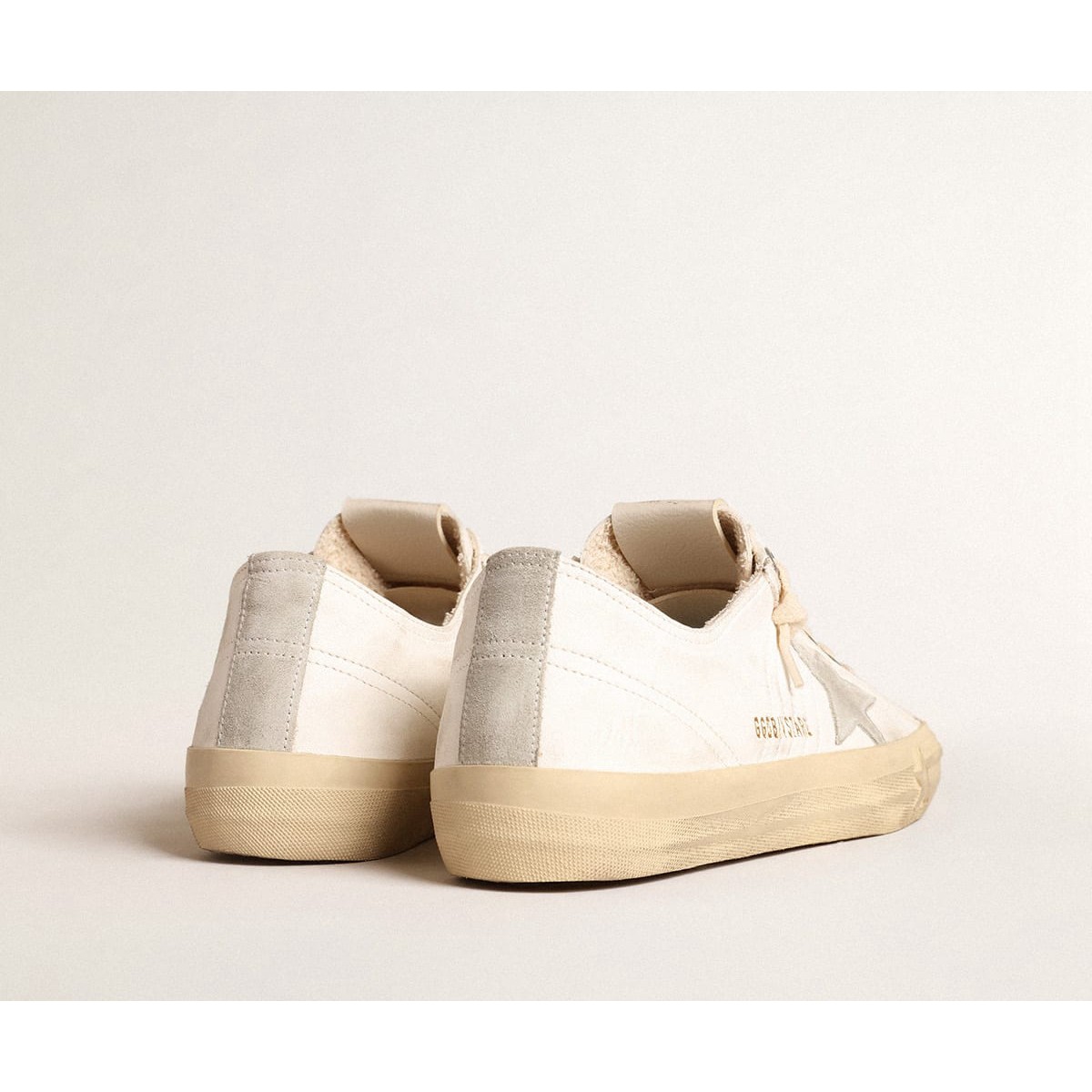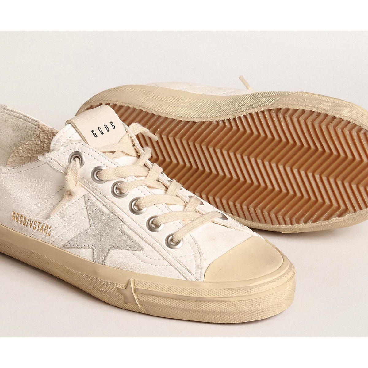 Scarpe Ginnastica a v-star femminile d’oca d’oro in cuoio nappa con stella e tavola del tallone gigo Scarpe Ginnastica a V-Star, una forma essenziale soddisfa i dettagli eleganti. Con una tomaia in pelle nappa bianca, questo modello presenta una stella in pelle scamosciata grigio ghiaccio e una linguetta del tallone. I lacci beige aggiungono il tocco finale.