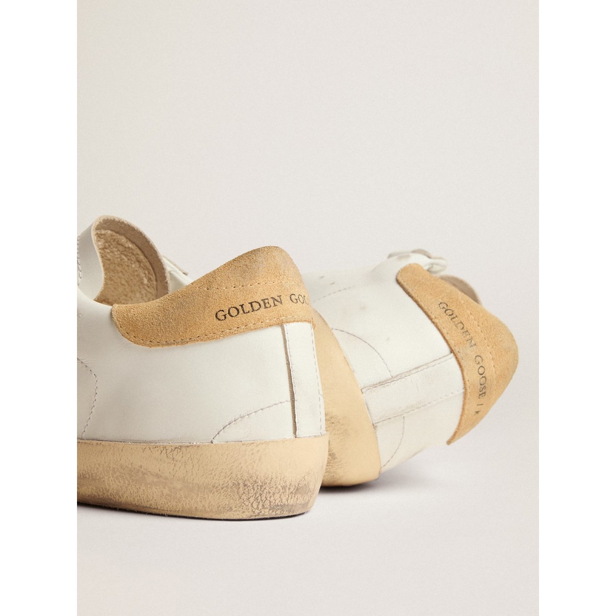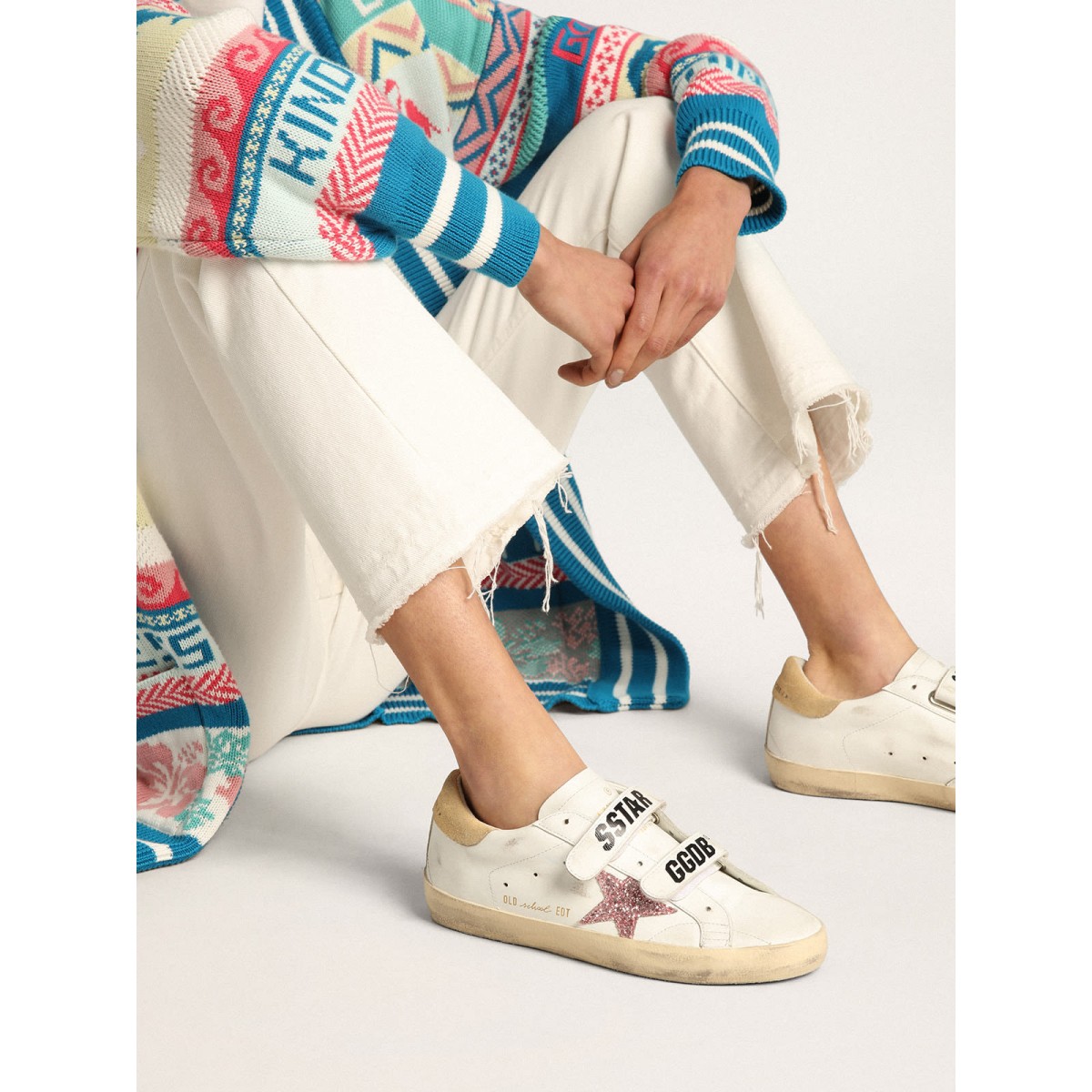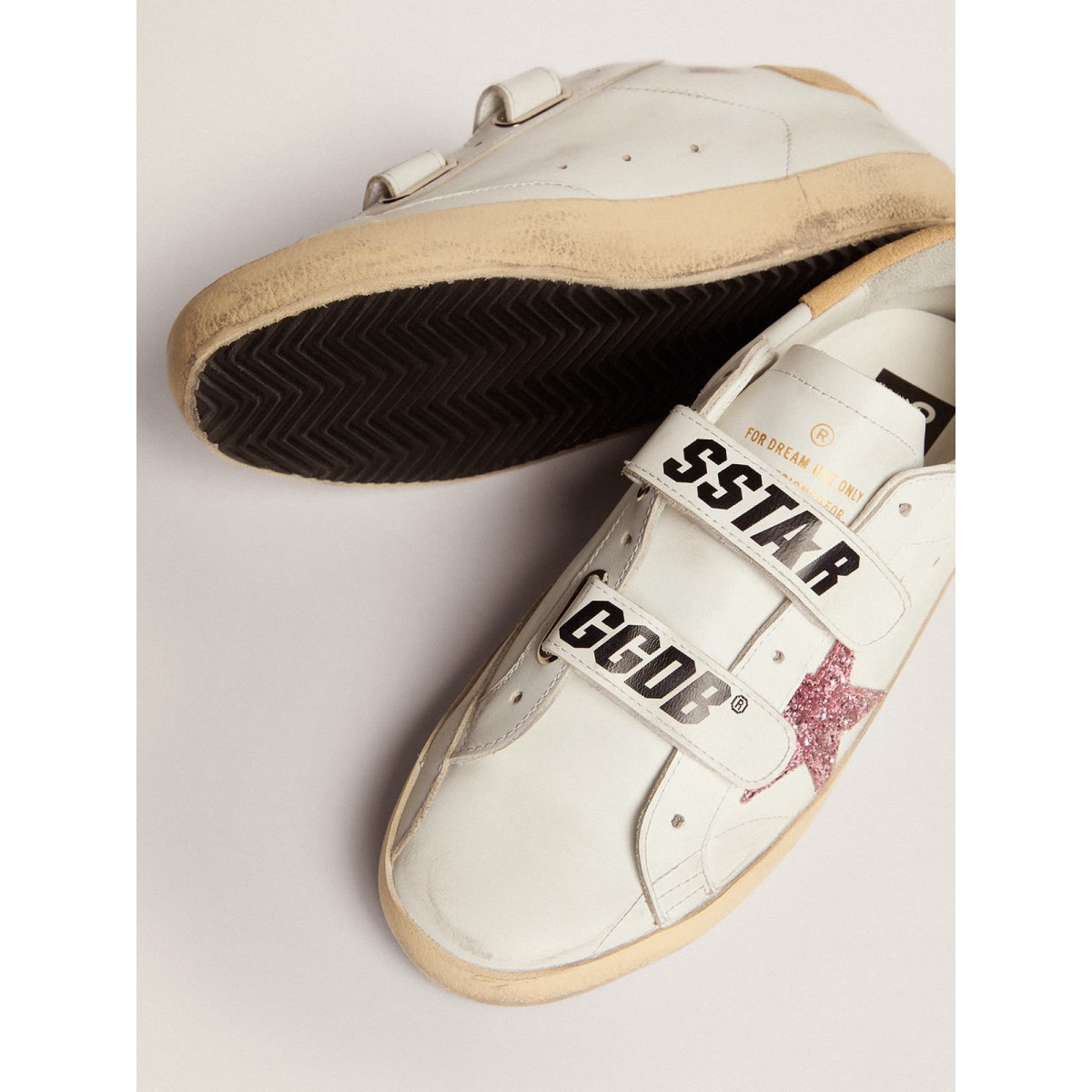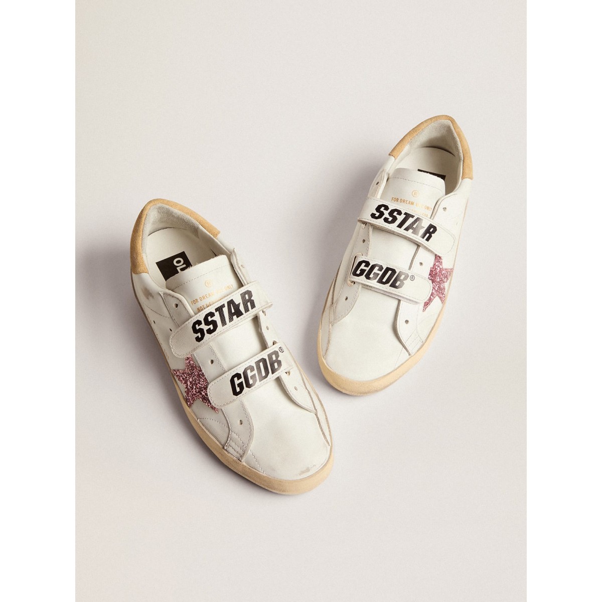 Le nostre Scarpe Ginnastica della vecchia scuola dispongono di due cinturini in velcro sul davanti con logo a contrasto. Questo modello con una tomaia in pelle bianca presenta una stella glitter rosa e una scheda tacco in pelle scamosciata color sabbia.