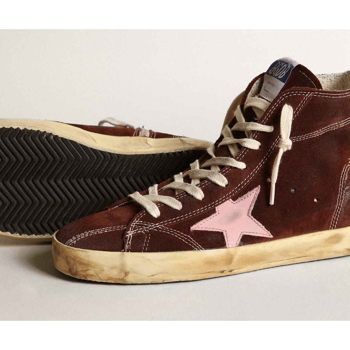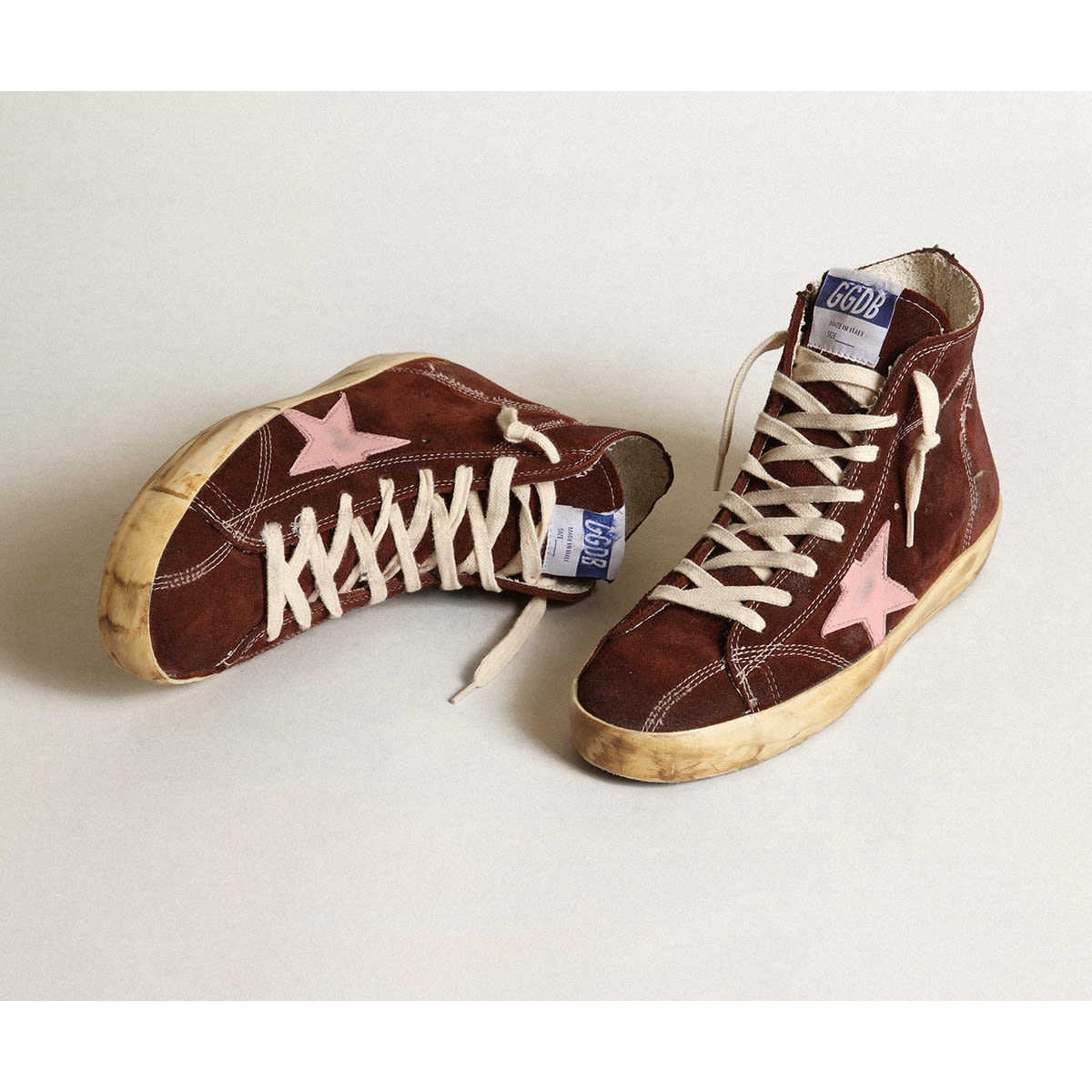 Scarpe Ginnastica francesi da donna dorata in pelle scamosciata marrone con stella in pelle rosa e tavola di cuoio nappa nero